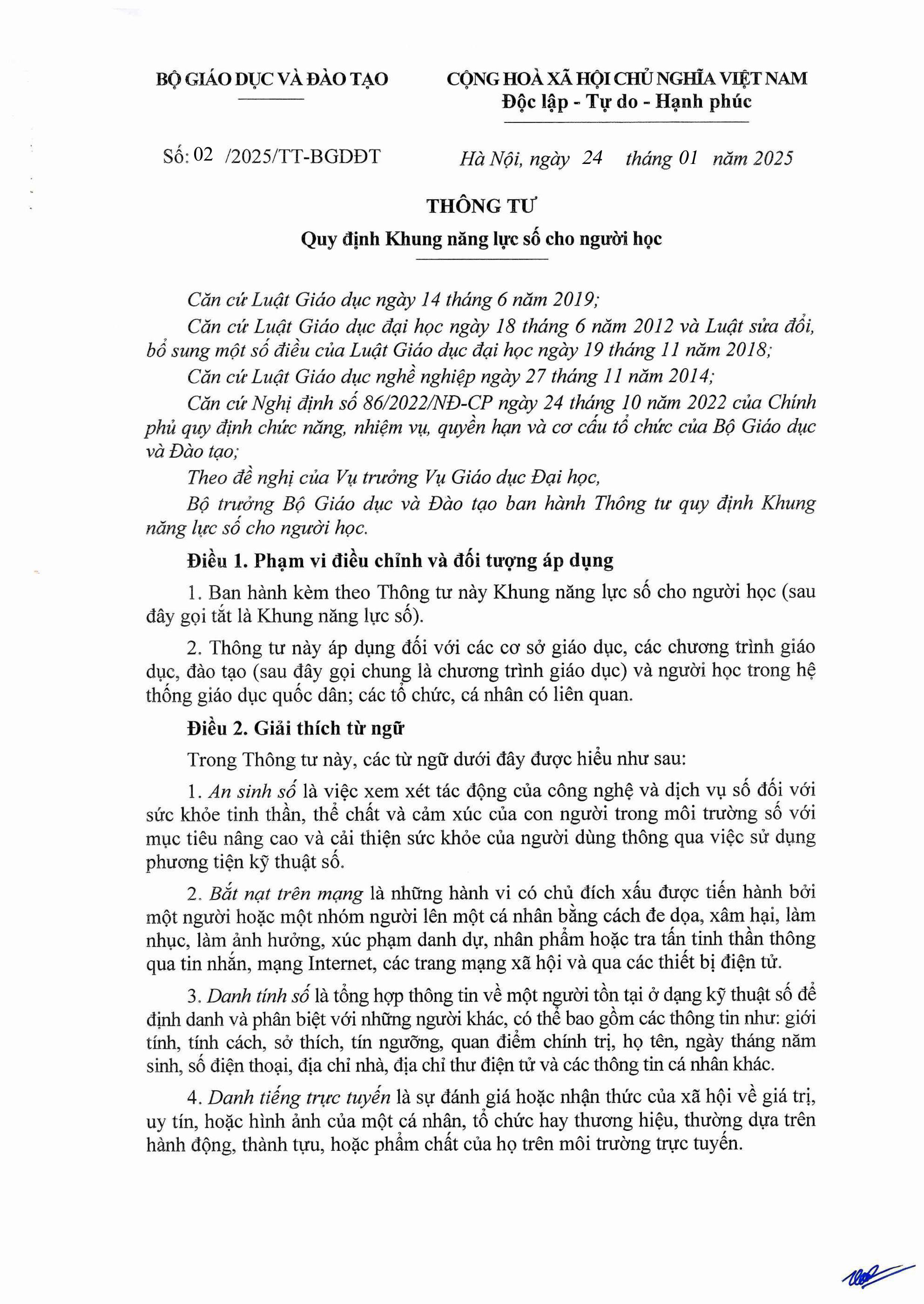Thông tư số 02/2025/TT-BGDĐT ngày 24/01/2025 của Bộ giáo dục và đào tạo ban hành "Quy định khung năng lực số cho người học"