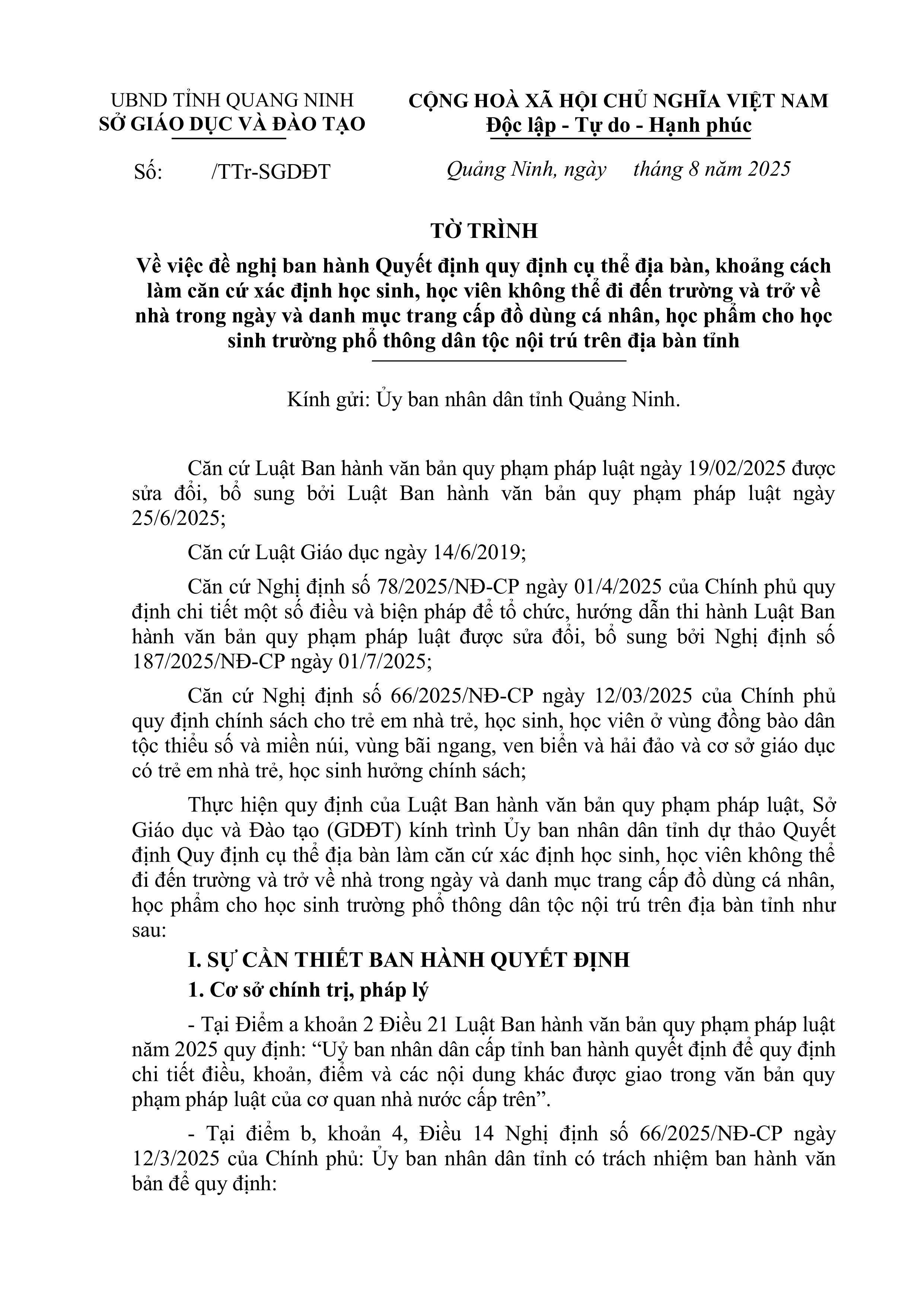 TỜ TRÌNH VÀ DỰ THẢO QUYẾT ĐỊNH: Về việc đề nghị ban hành Quyết định quy định cụ thể địa bàn, khoảng cách làm căn cứ xác định học sinh, học viên không thể đi đến trường và trở về nhà trong ngày và danh mục trang cấp đồ dùng cá nhân, học phẩm cho học sinh trường phổ thông dân tộc nội trú trên địa bàn tỉnh