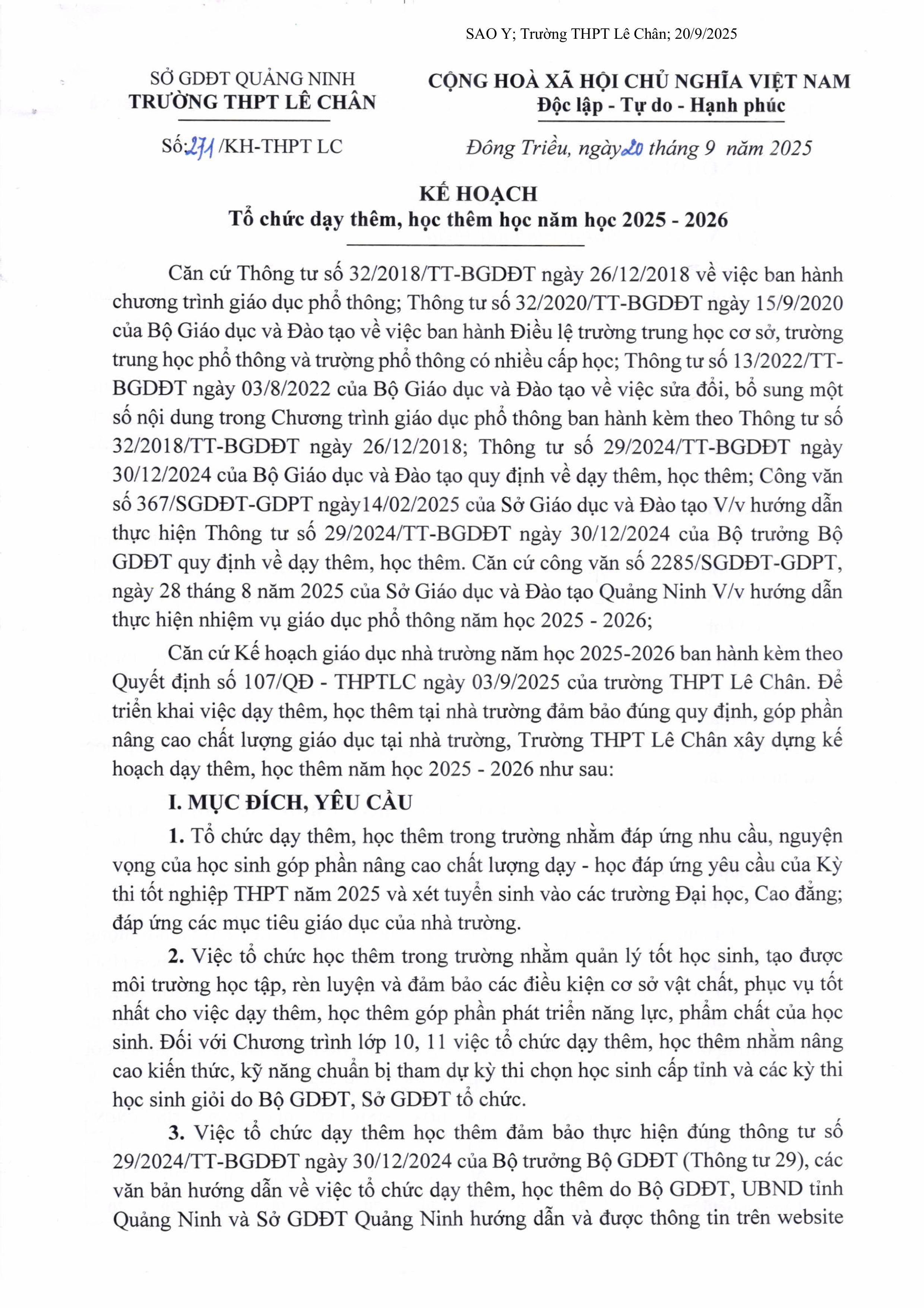 Kế hoạch số 271/KH-THPT LC ngày 20/9/2025 của trường THPT Lê Chân về việc Tổ chức dạy thêm, học...
