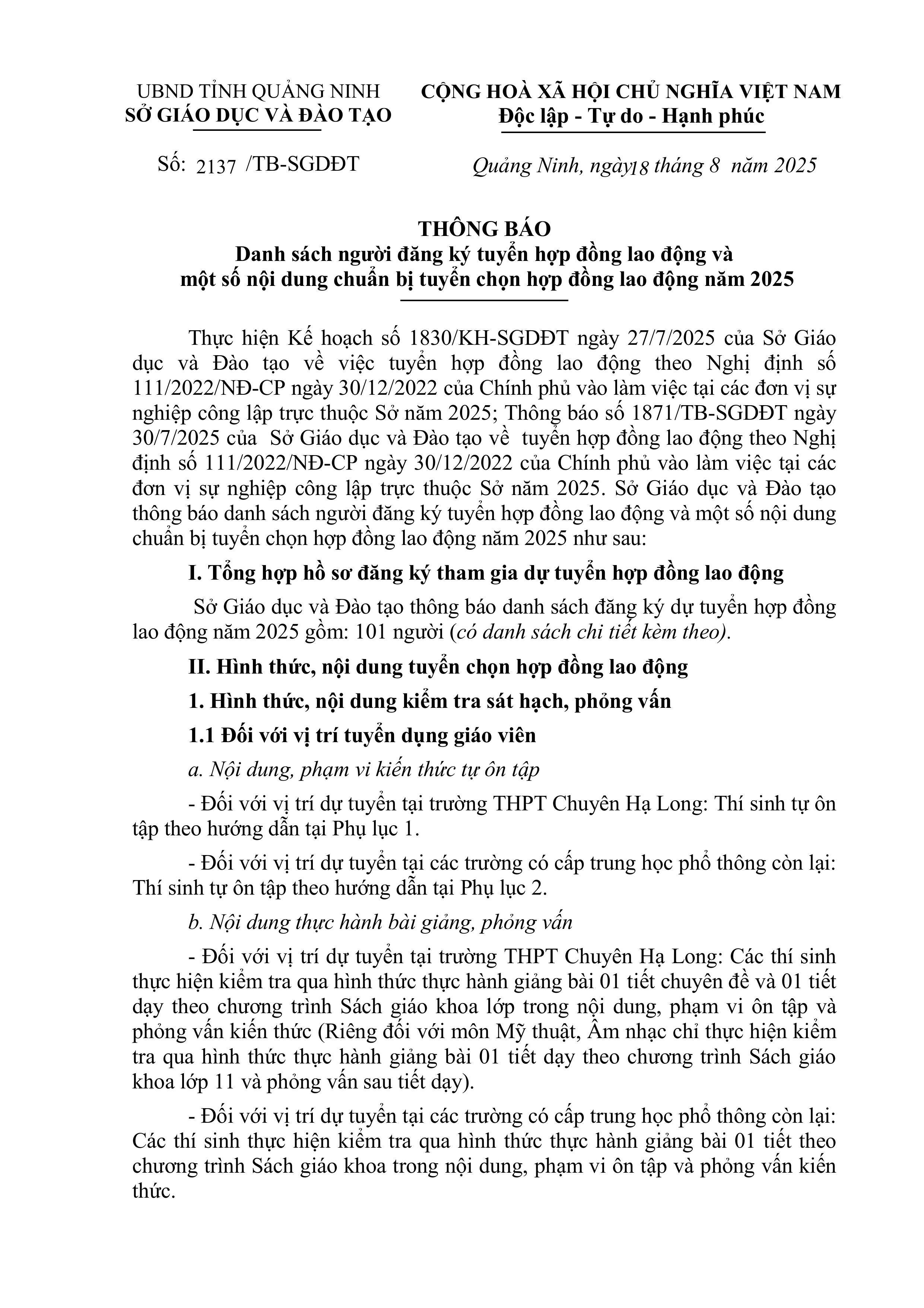 Thông báo số 2137/TB-SGDĐT ngày 18/8/2025 Danh sách người đăng ký tuyển hợp đồng lao động và một số nội dung chuẩn bị tuyển chọn hợp đồng lao động năm 2025