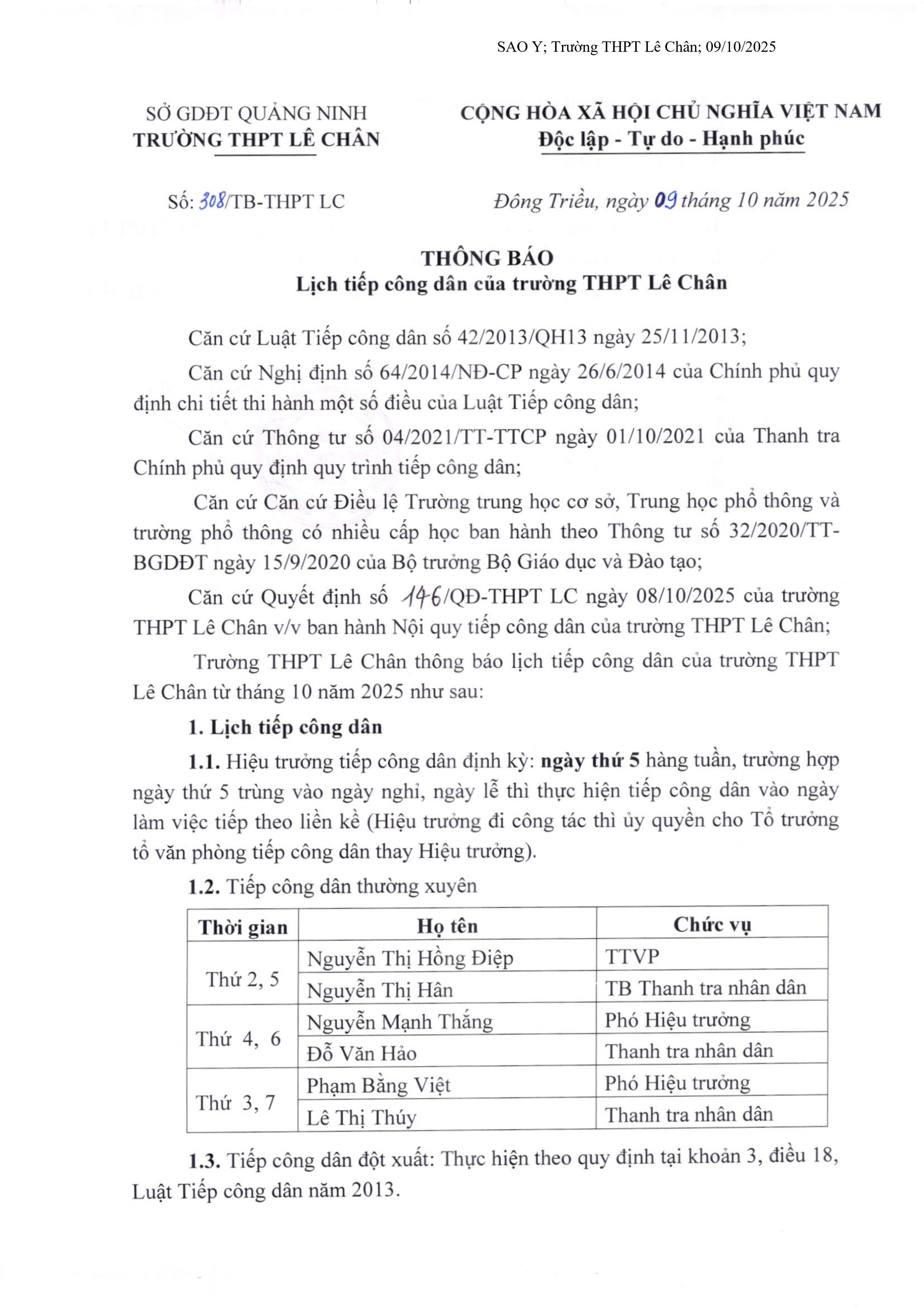 Thông báo số 308/TB-THPT LC ngày 09/10/2025 của Trường THPT Lê Chân về việcThông báo lịch tiếp công dân của trường THPT Lê Chân