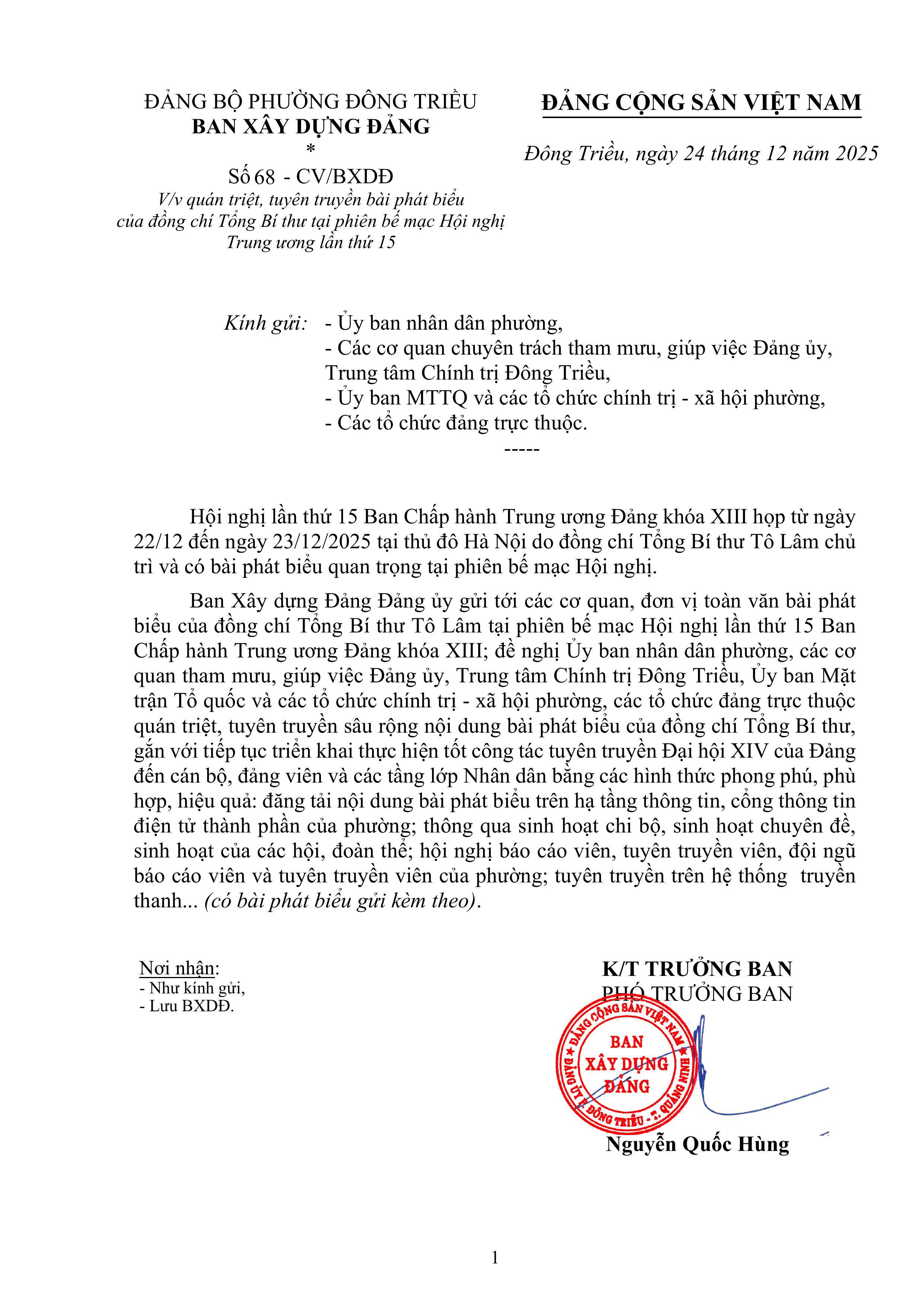 Công văn số 68-CV/BXDĐ ngày 24/12/2025 của Đảng bộ Phường Đông Triều "Về việc quán triệt, tuyên truyền bài phát biểu của đồng chí Tổng Bí thư tại phiên bế mạc Hội nghị Trung ương lần thứ 15"