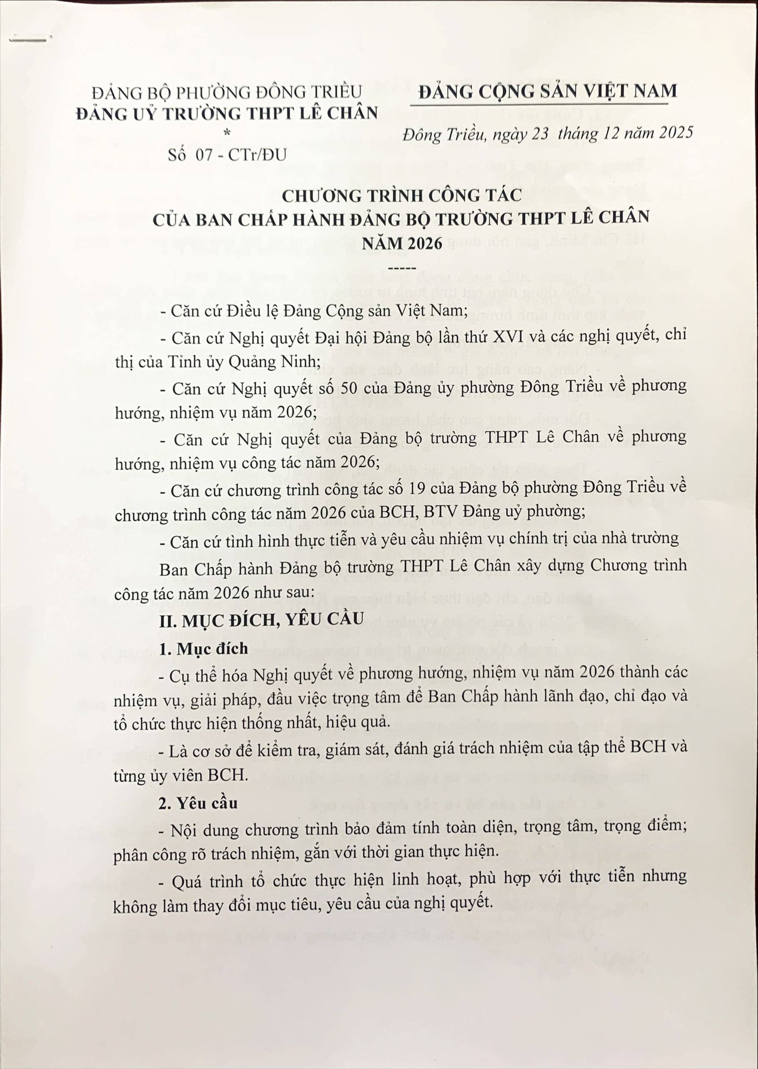 Chương trình công tác của Ban chấp hành Đảng bộ trường THPT Lê Chân năm 2026