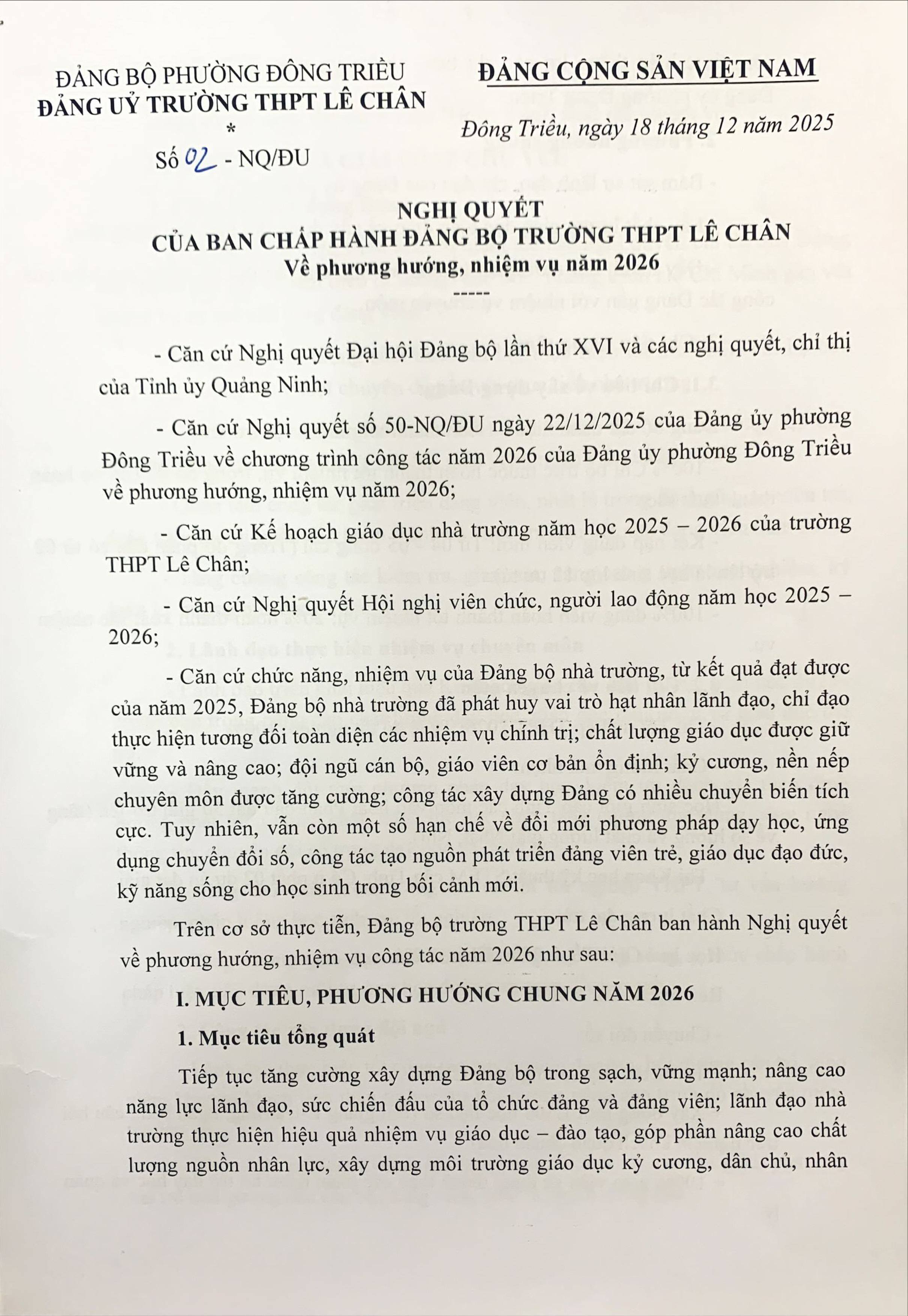 Nghị quyết của Ban chấp hành Đảng bộ trường THPT Lê Chân về phương hướng, nhiệm vụ năm 2026