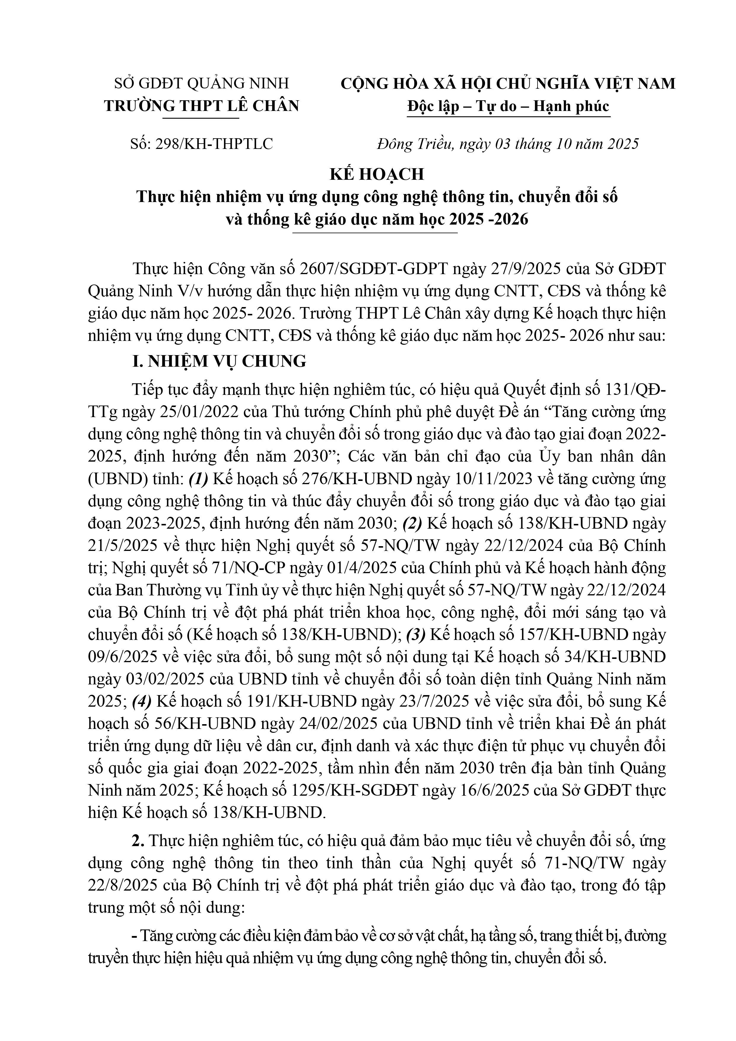 Kế hoạch số 298/KH-THPT LC ngày 03/10/2025 của Trường THPT Lê Chân về việc Thực hiện nhiệm vụ ƯD...