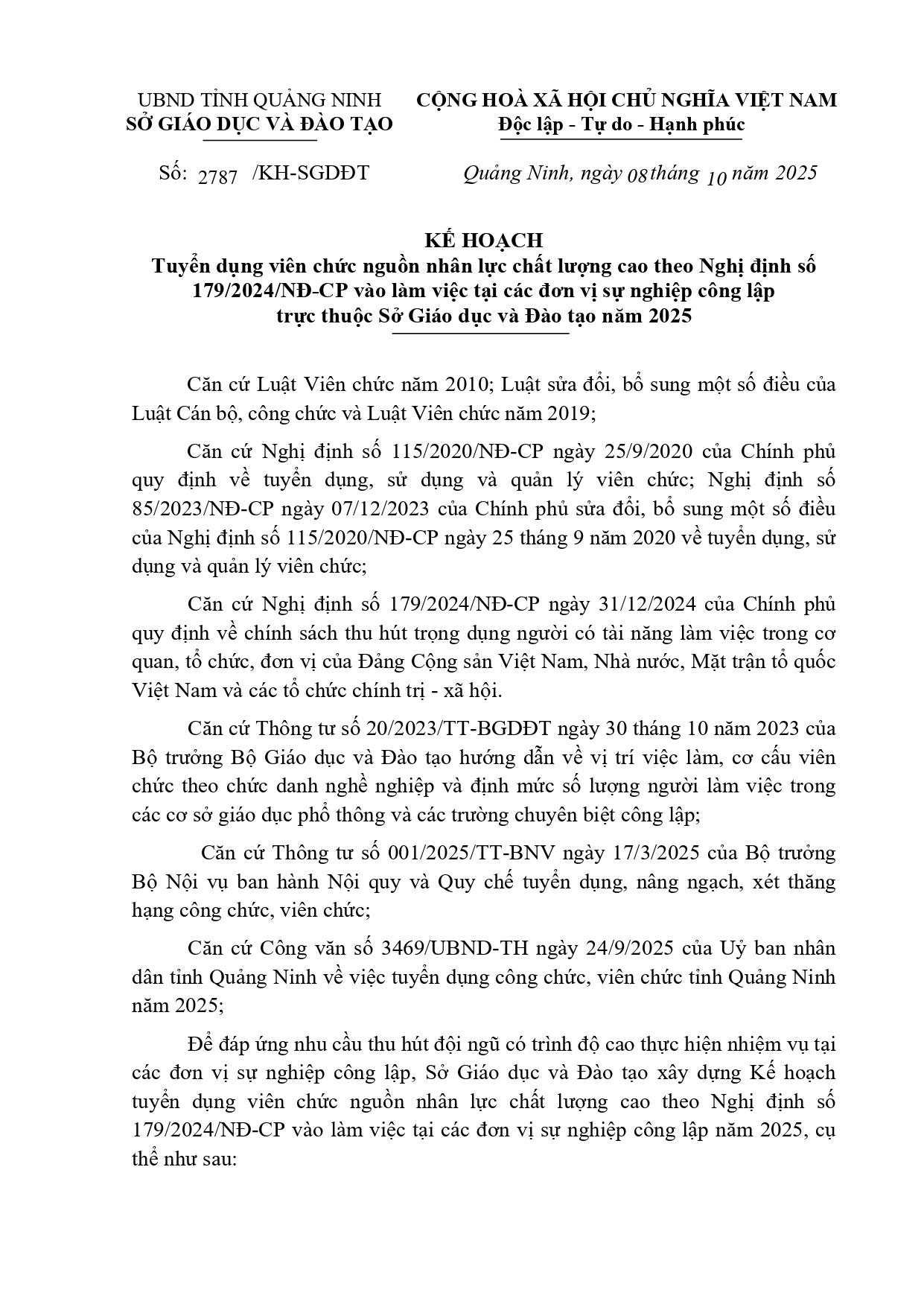 Kế hoạch số 2787/KH-SGDĐT ngày 08/10/2025 của Sở Giáo dục và Đào tạo về việc Tuyển dụng viên chức...