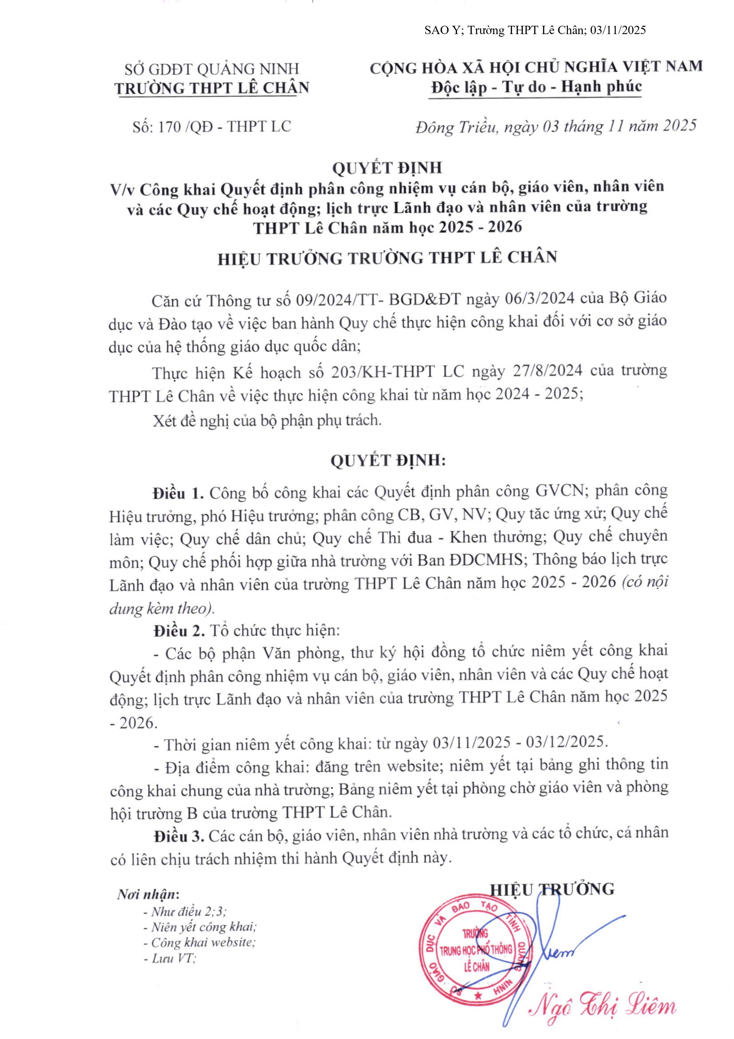 Quyết định số 170/QĐ-THPT LC ngày 03/11/2025 của Trường THPT Lê Chân về việc Công khai quyết định phân công nhiệm vụ, cán bộ, giáo viên, nhân viên và các Quy chế hoạt động; lịch trực Lãnh đạo và nhân viên của trường THPT Lê Chân năm học 2025 - 2026