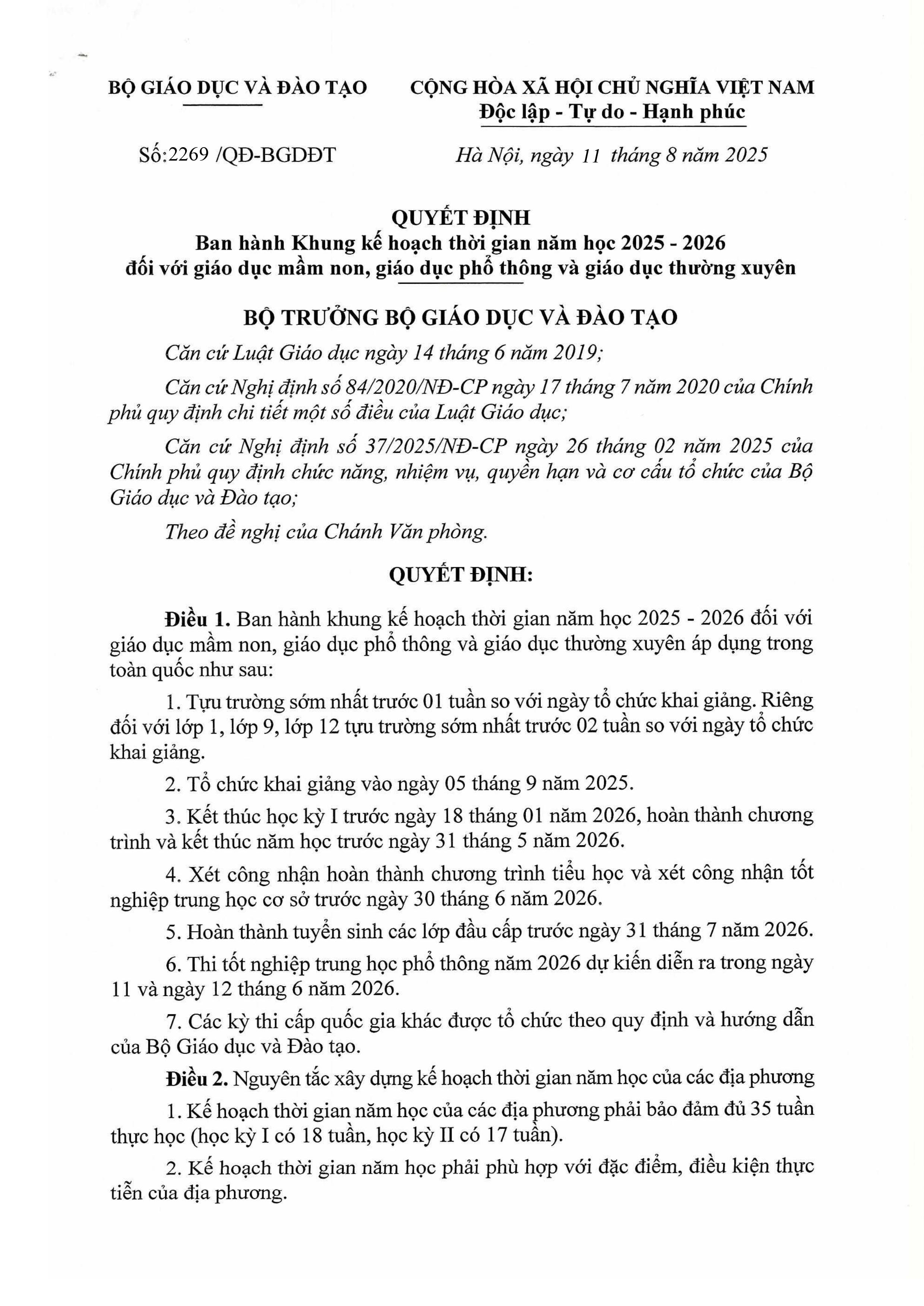 Quyết định số 2269/QĐ-BGDĐT ngày 11/08/2025 của Bộ Giáo dục và Đào tạo Khung kế hoạch thời gian năm...