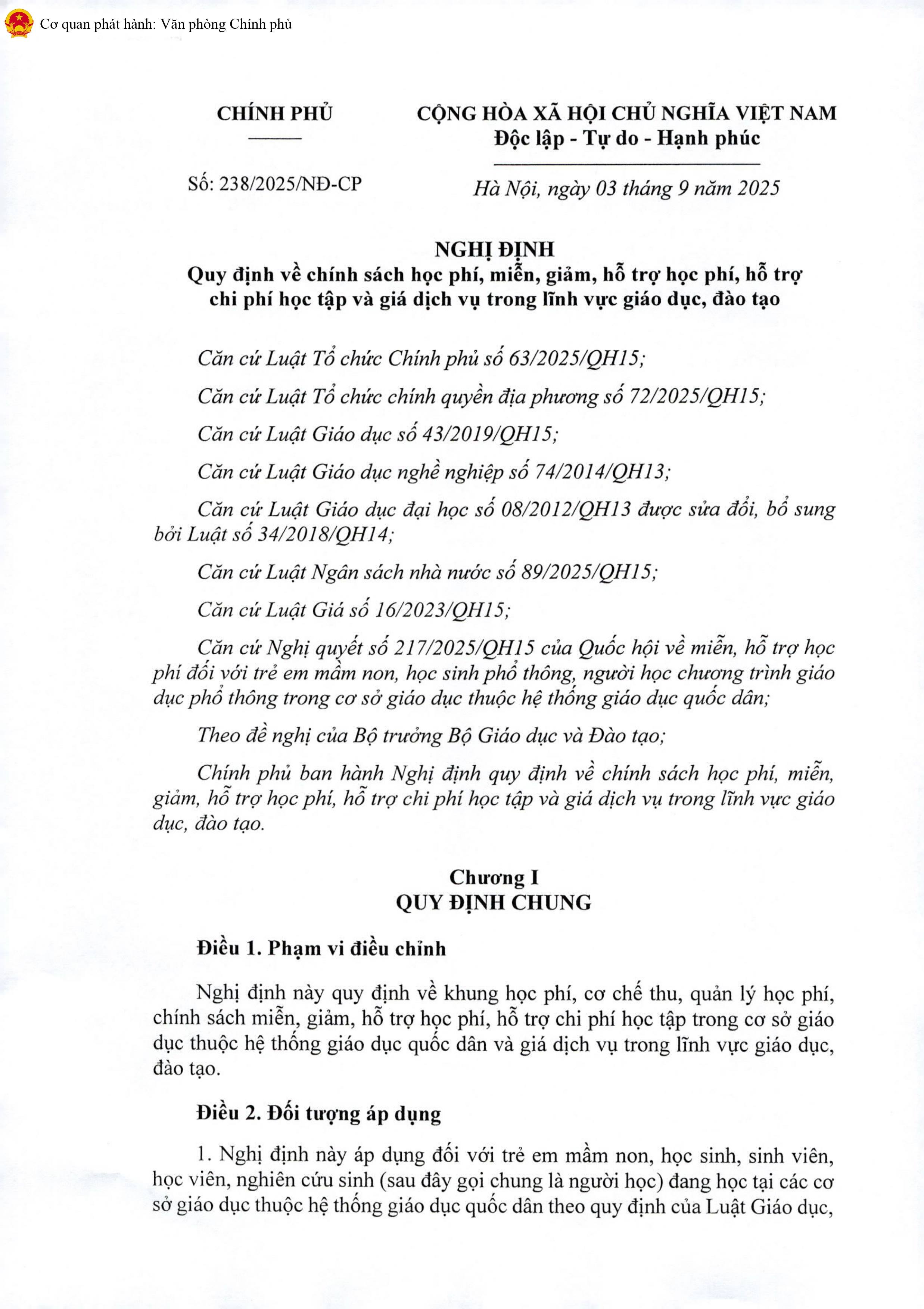 Nghị định số 238/2025/NĐ-CP của Chính phủ, ban hành ngày 03/9/2025, Quy định về chính sách học phí,...