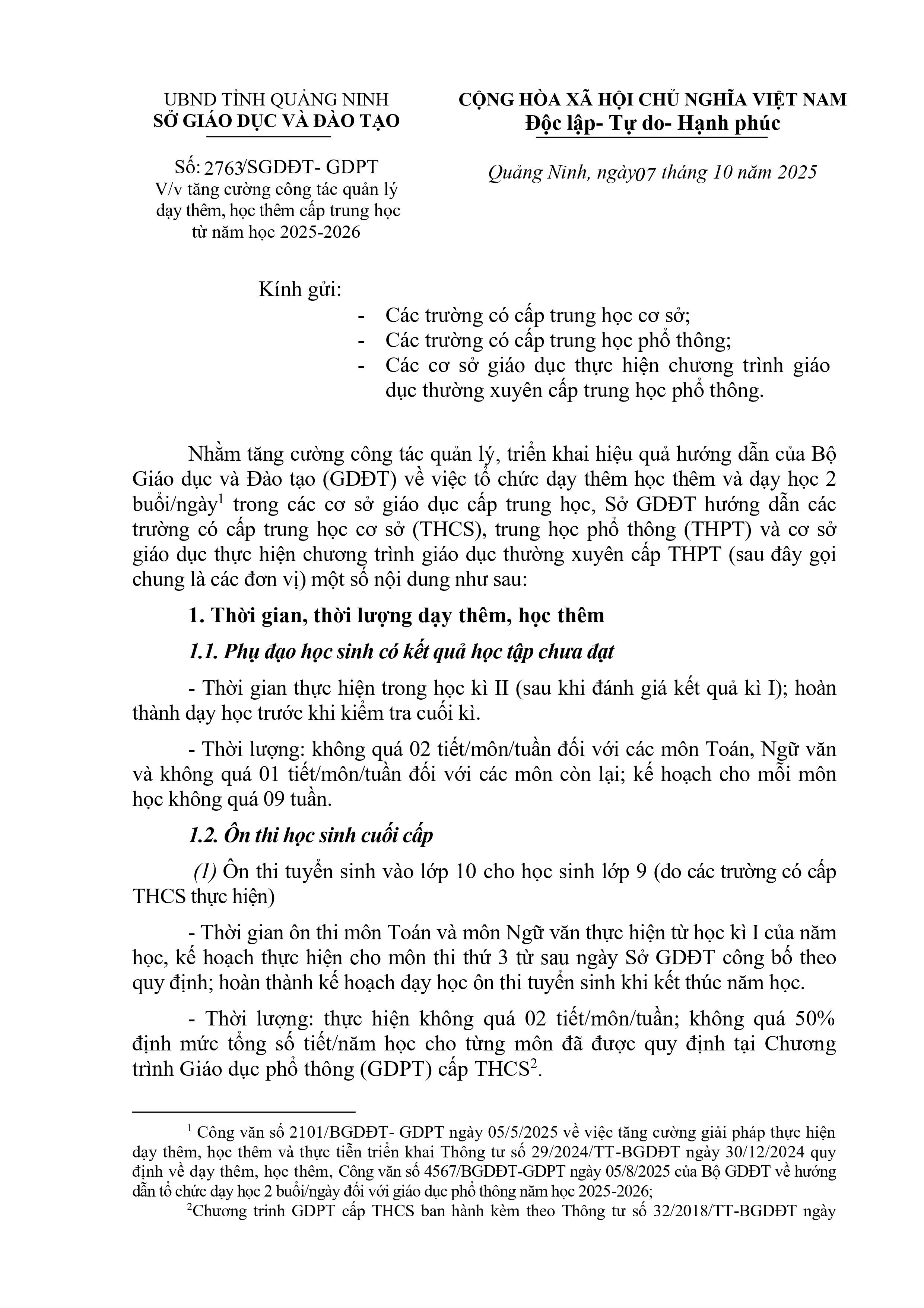 Công văn số 2763/SGDĐT-GDPT ngày 07/10/2025 của Sở Giáo dục và Đào tạo Về việc tăng cường công tác...