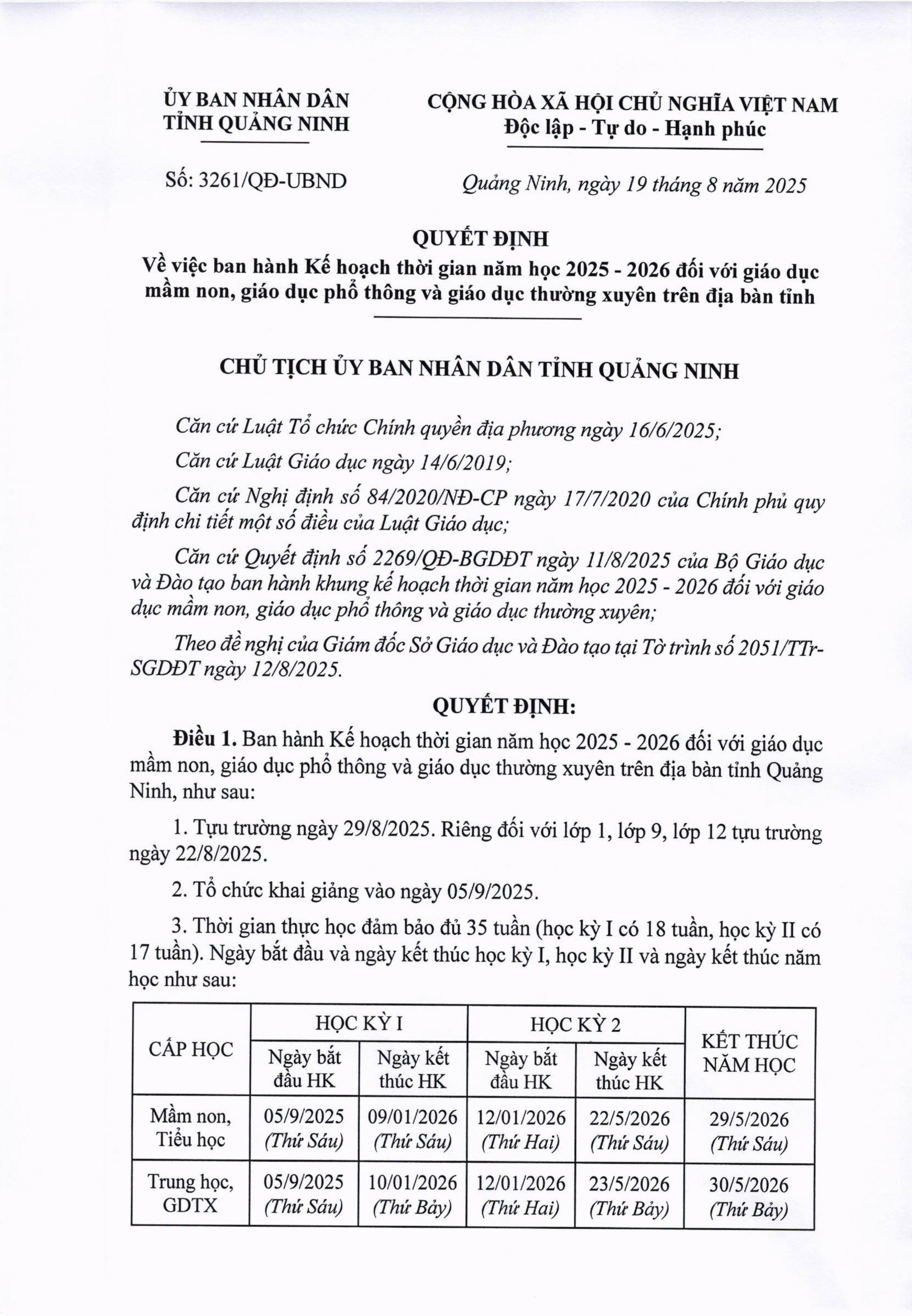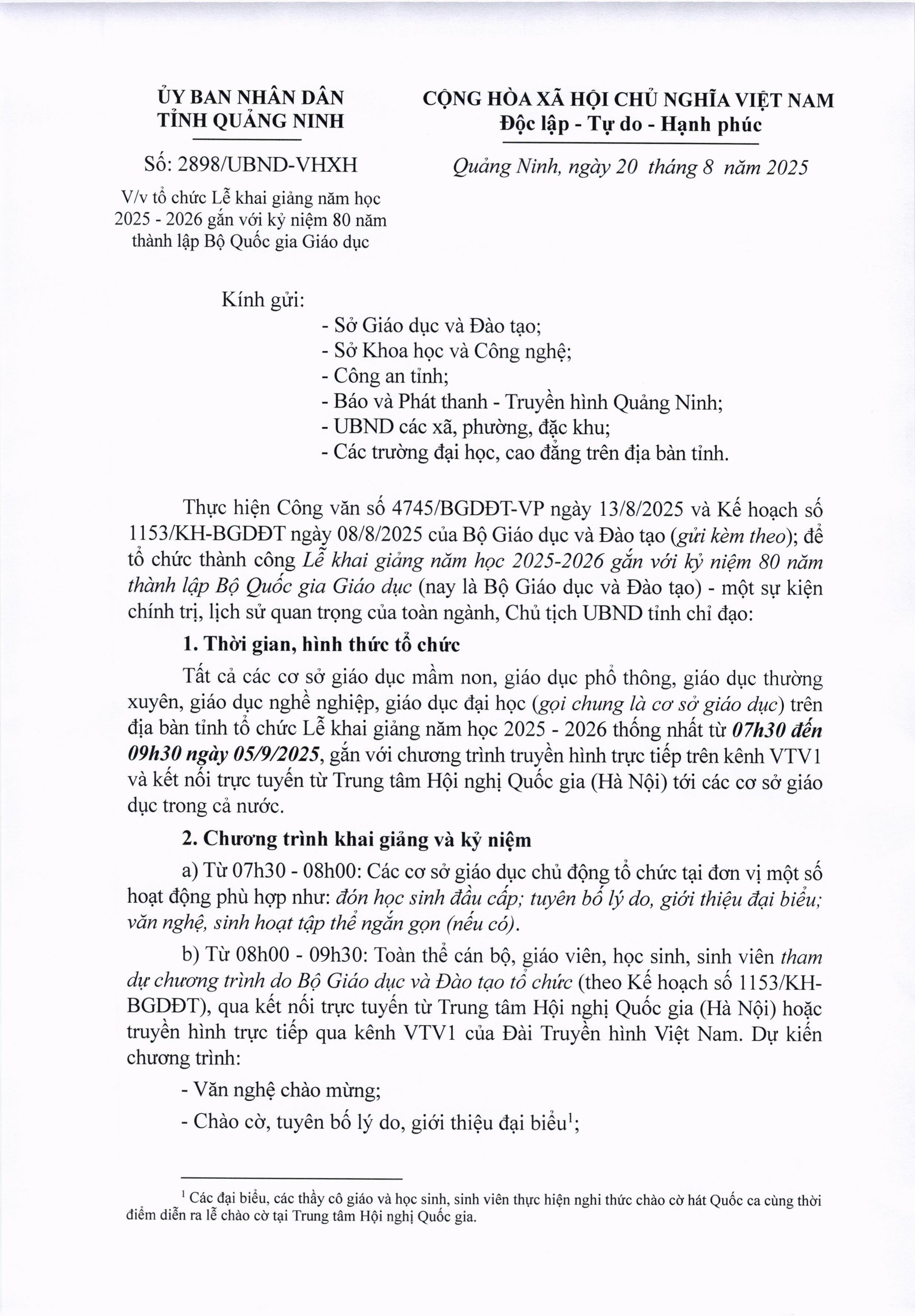 Công văn số 2898/UBND-VHXH ngày 20/8/2025 của UBND tỉnh Quảng Ninh V/v tổ chức Lễ khai giảng năm...
