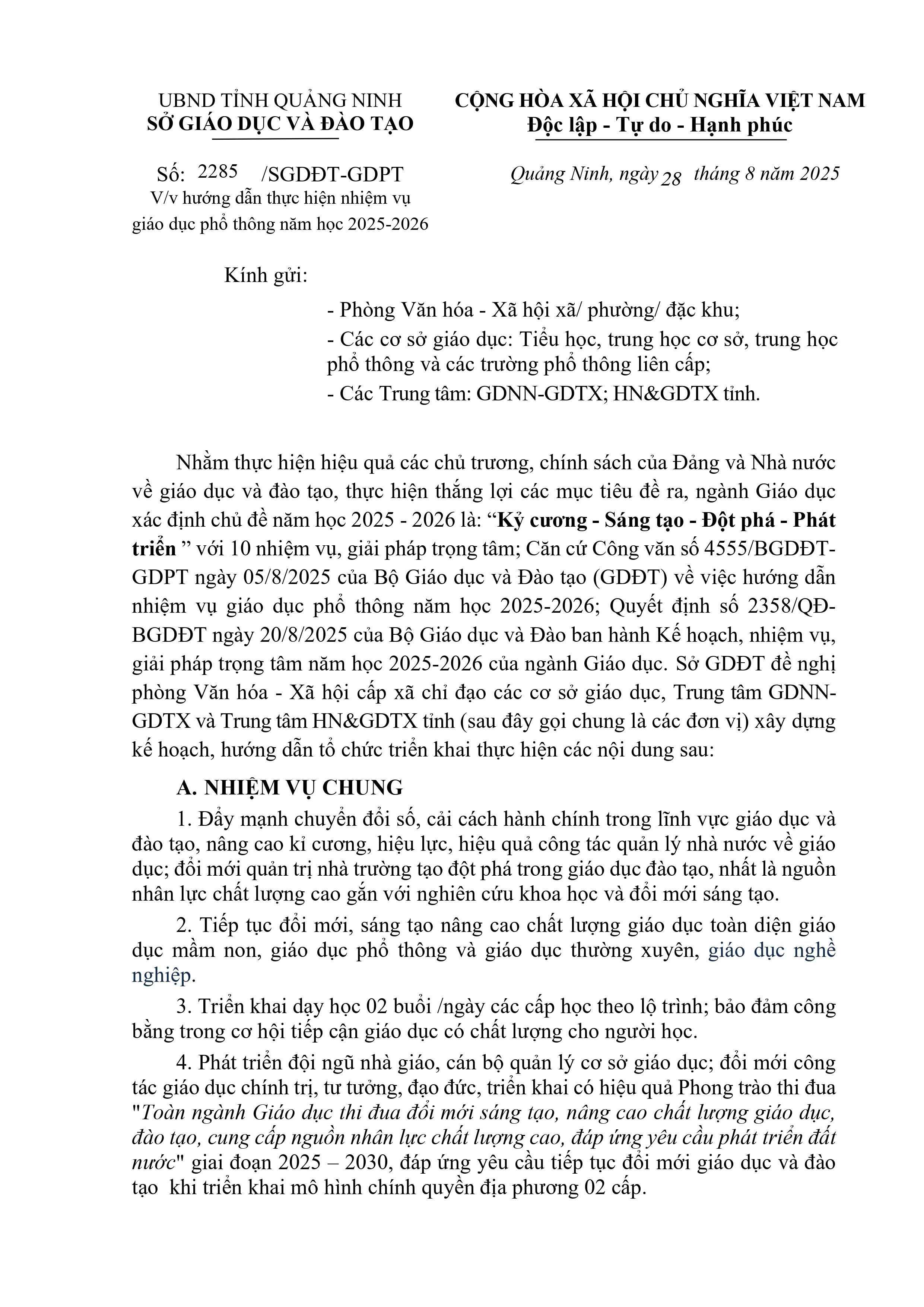 Công văn số 2285/SGDĐT-GDPT ngày 28/08/2025 của Sở Giáo dục và Đào tạo V/v hướng dẫn thực hiện...