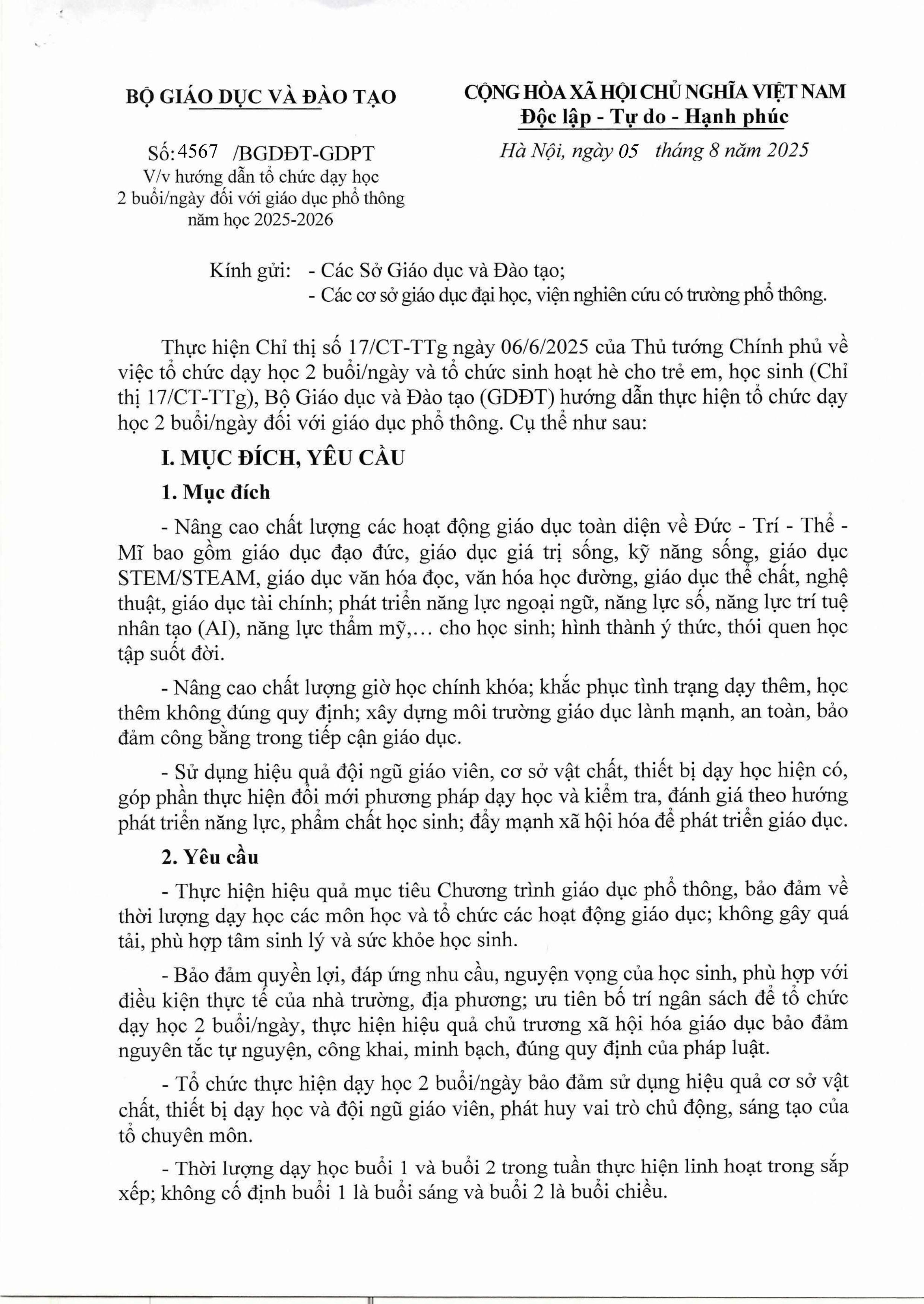 Công văn số 4567/BGDĐT-GDPT ngày 05/08/2025 của Bộ Giáo dục và Đào tạo về việc Hướng dẫn tổ chức...