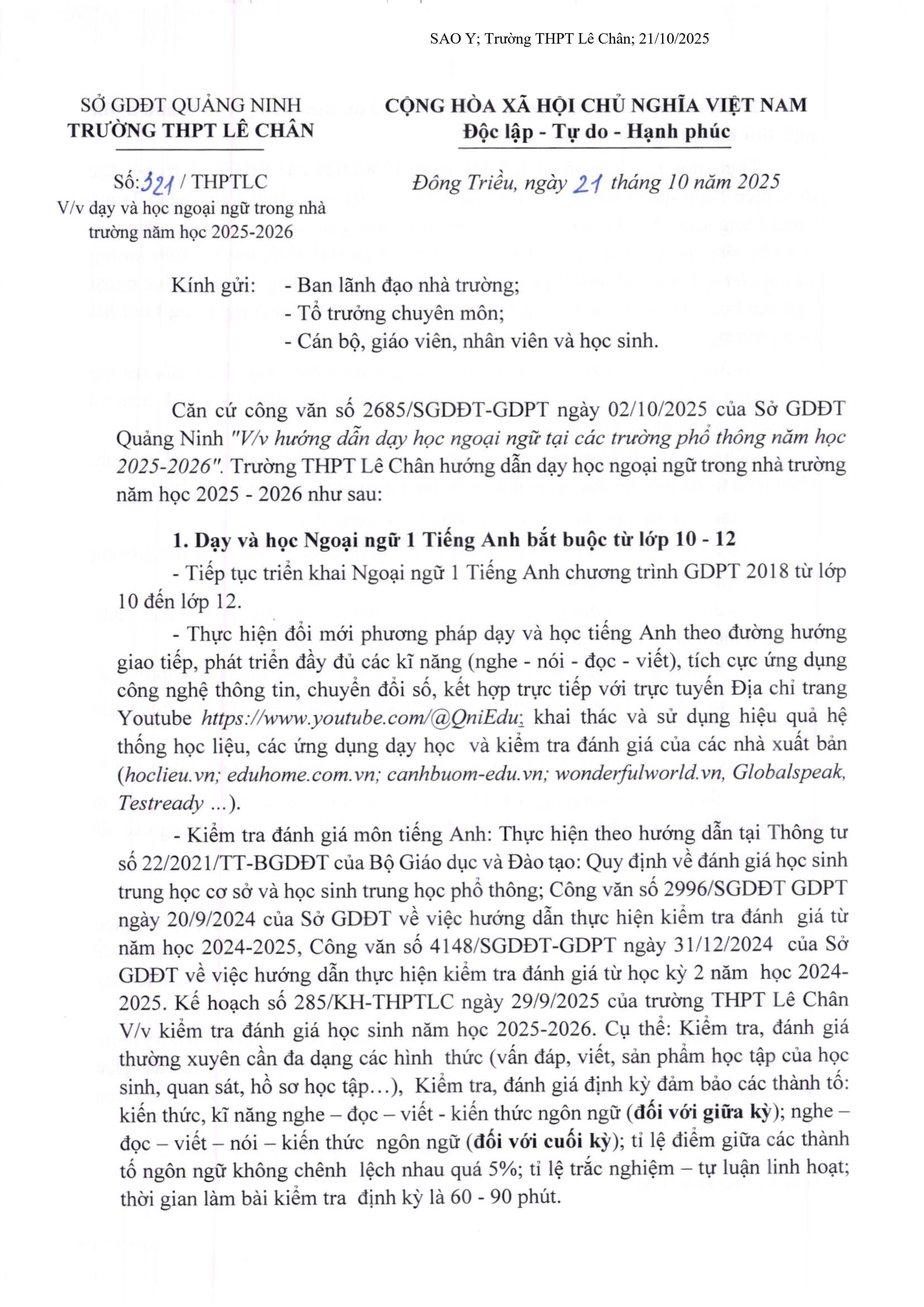 Công văn số 321/THPT LC ngày 21/10/2025 của trường THPT Lê Chân về việc Dạy và học ngoại ngữ trong nhà trường năm học 2025 - 2026