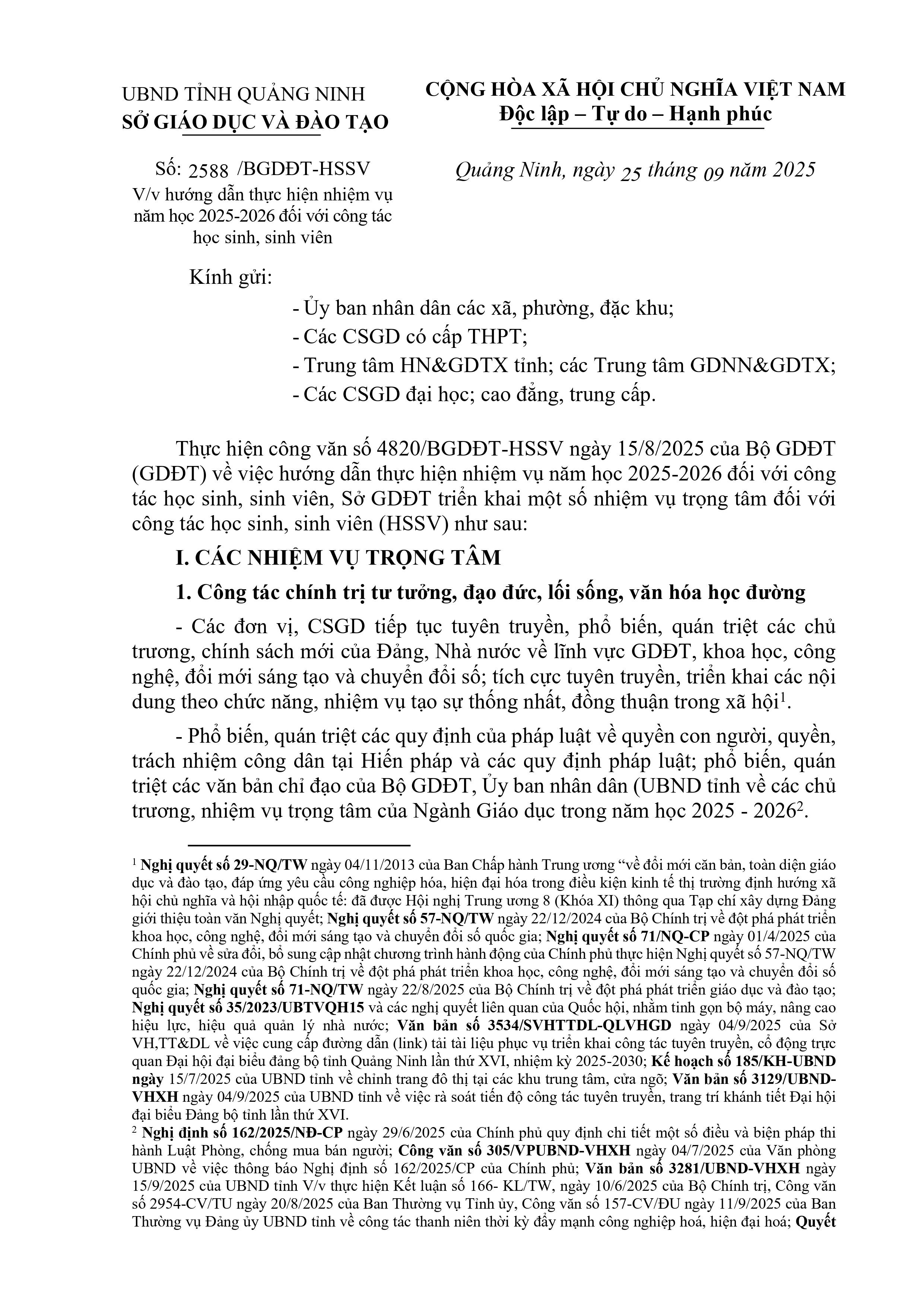Công văn số 2588/BGDĐT-GDPT ngày 25/09/2025 của Bộ Giáo dục và Đào tạo V/v Hướng dẫn thực hiện...