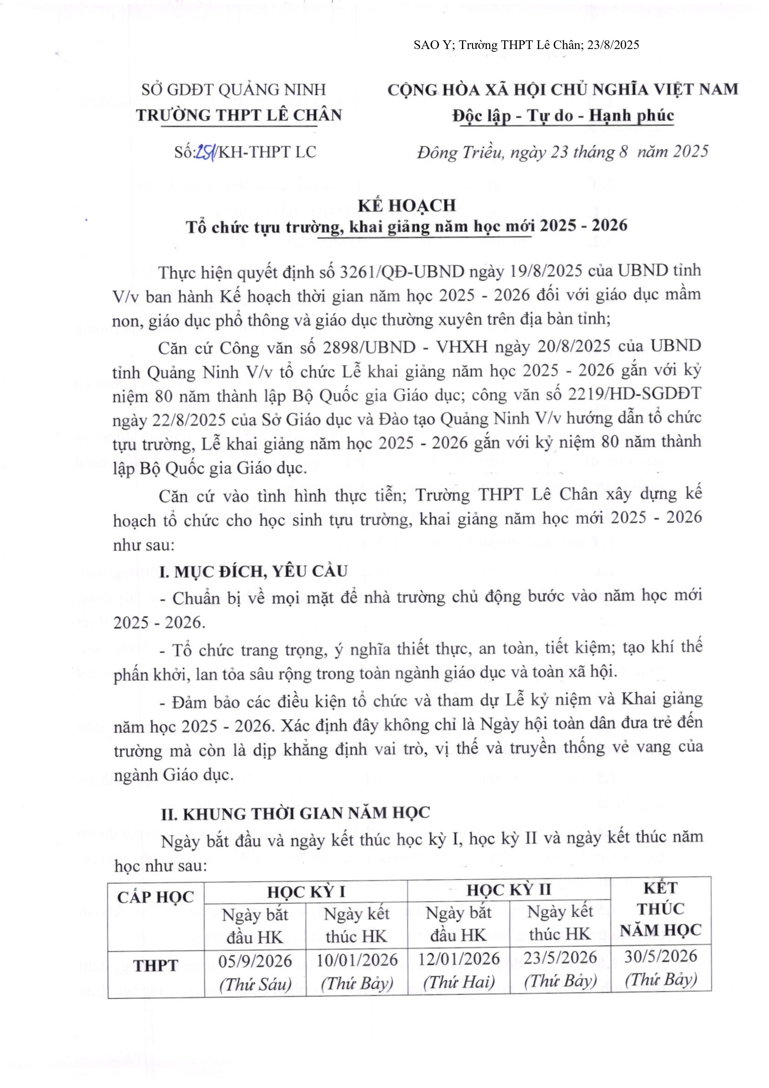 Kế hoạch số 251/KH-THPT LC ngày 23/8/2025 của trường THPT Lê Chân về việc Tổ chức tựu trường, khai...