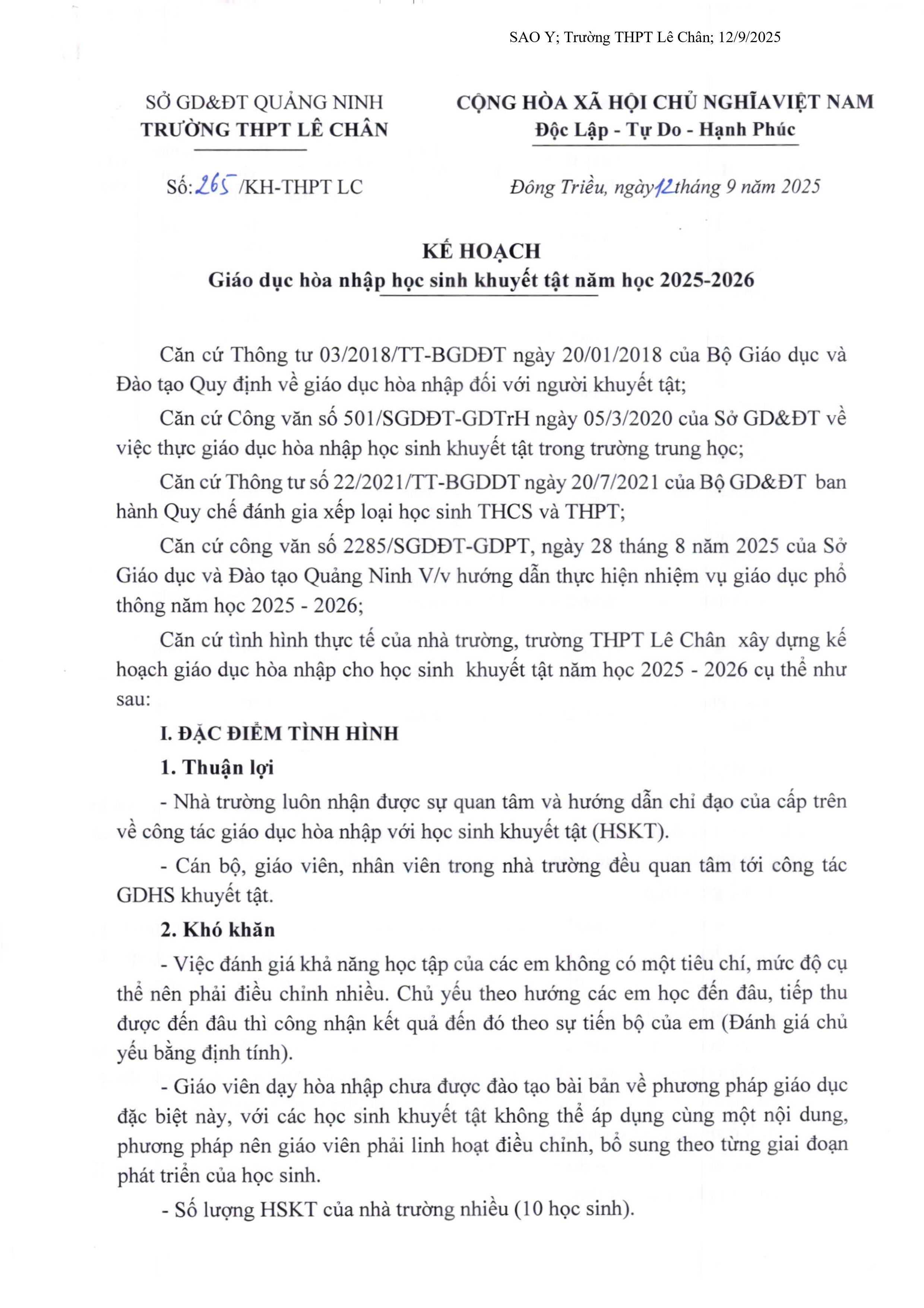 Kế hoạch số 265/KH-THPT LC ngày 12/09/2025 của trường THPT Lê Chân về việc Giáo dục hoà nhập học...