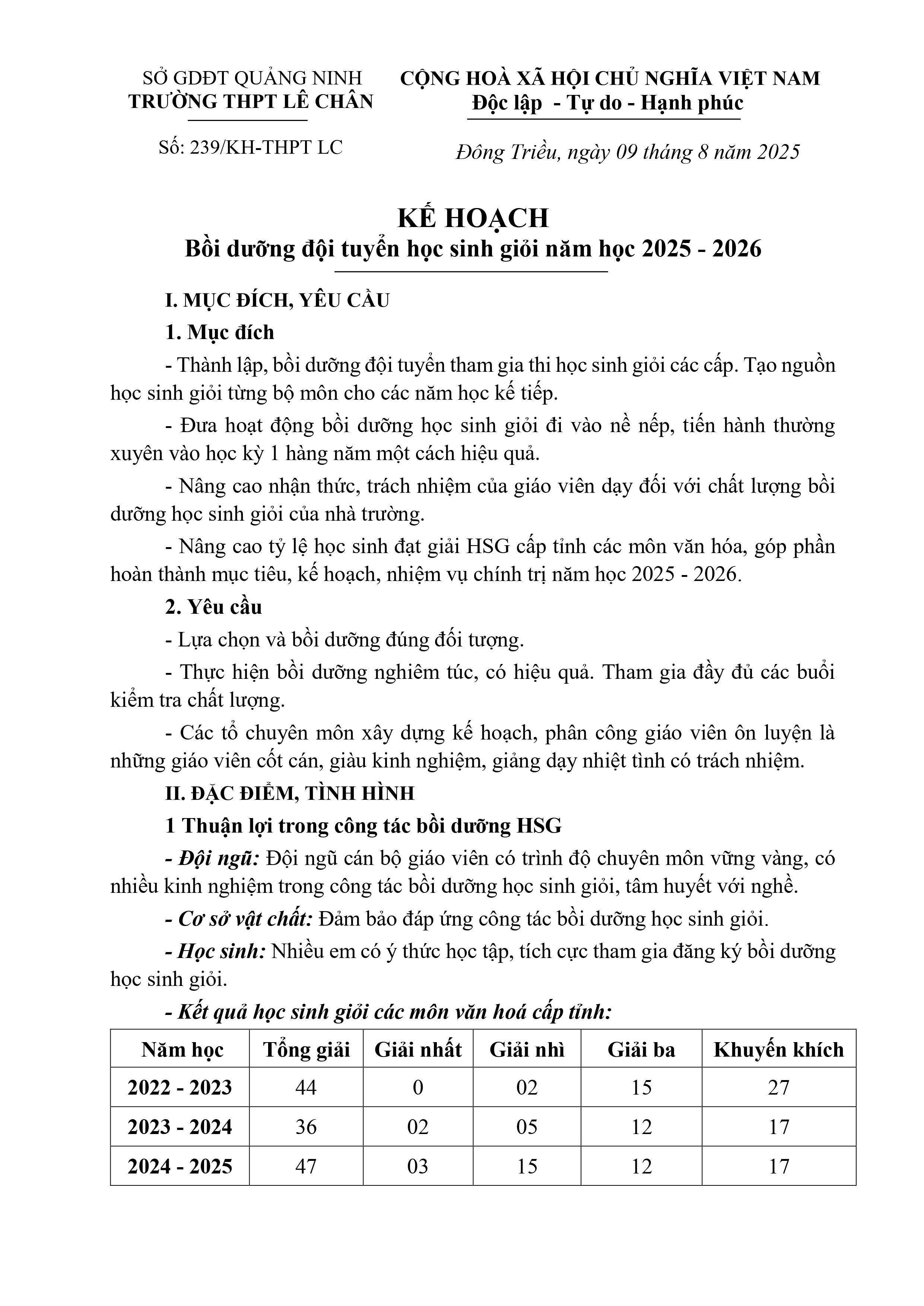 Kế hoạch số 239/KH-THPT LC ngày 09/8/2025 của trường THPT Lê Chân về việc Bồi dưỡng đội tuyển học...