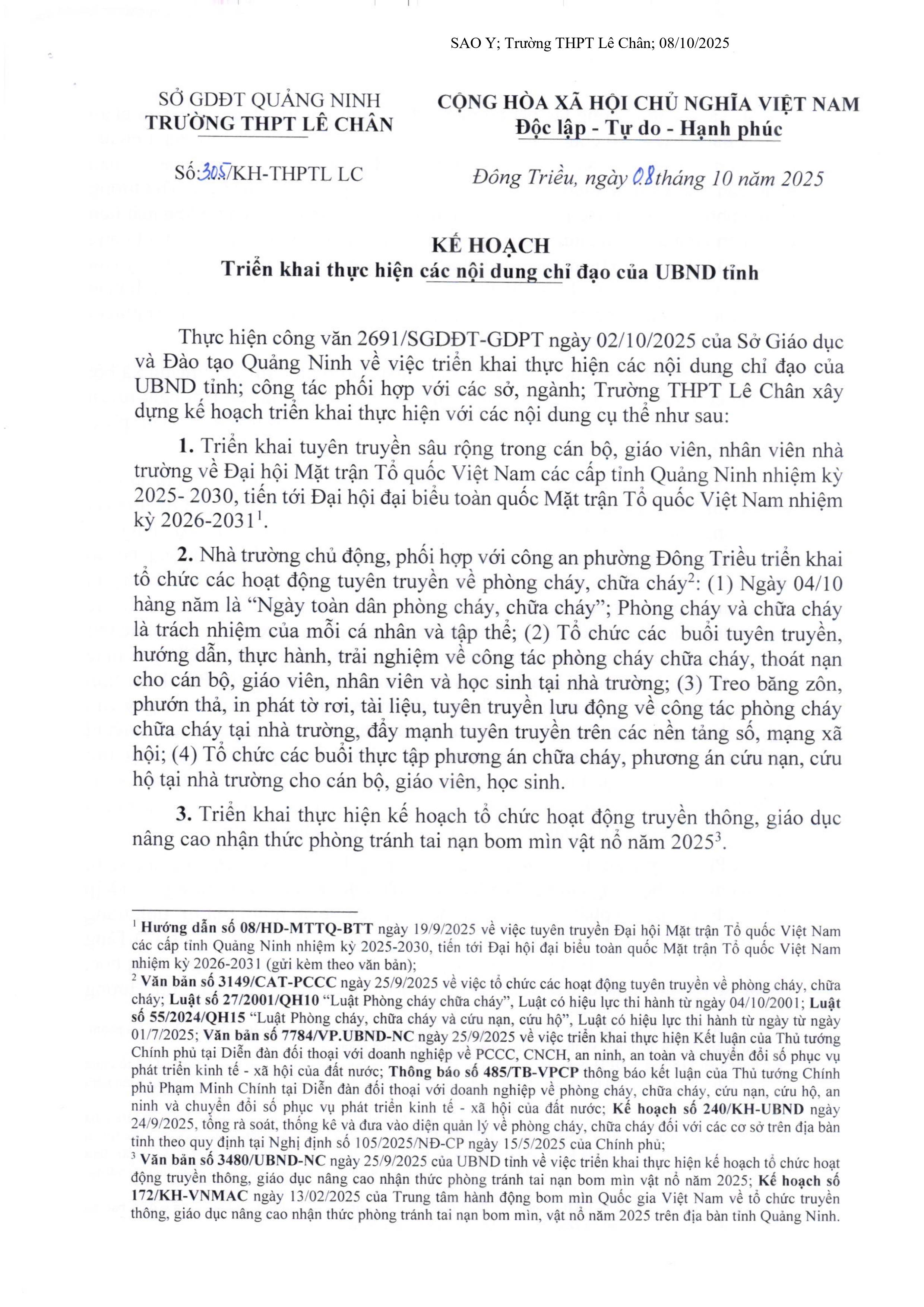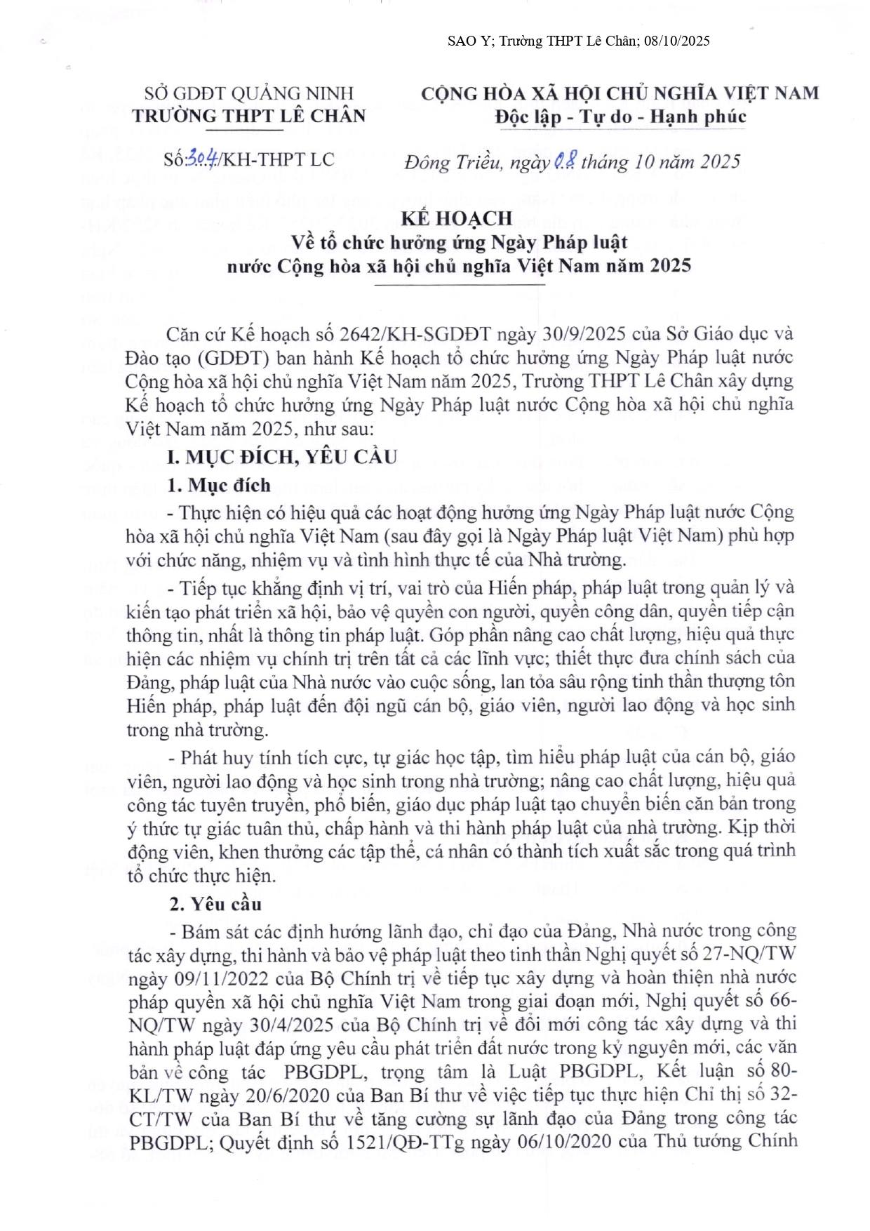 Kế hoạch số 305/KH-THPT LC ngày 08/10/2025 của trường THPT Lê Chân về việc Triển khai các nội dung...