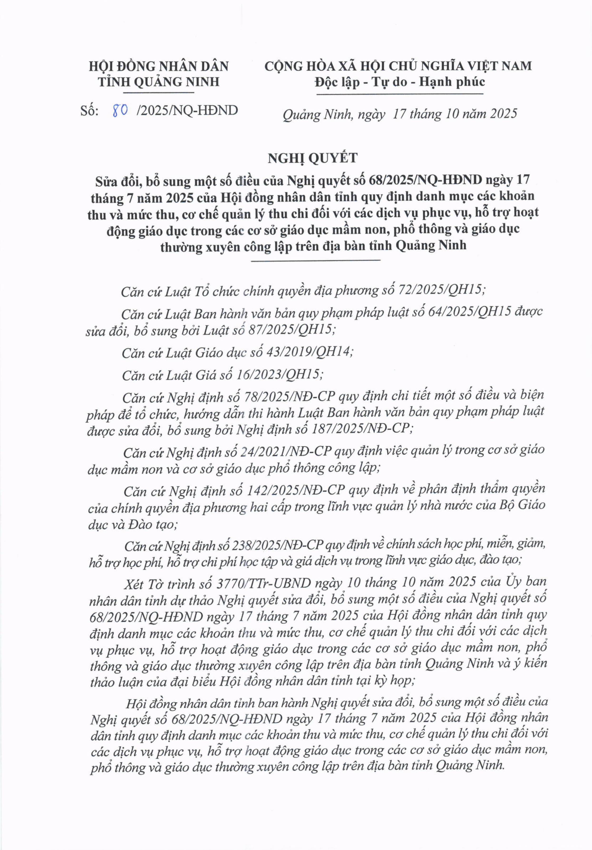 Nghị quyết số 80/2025/NQ-HĐND ngày 23/9/2024 của Hội đồng Nhân dân tỉnh Quảng Ninh Về Sửa đổi, bổ...