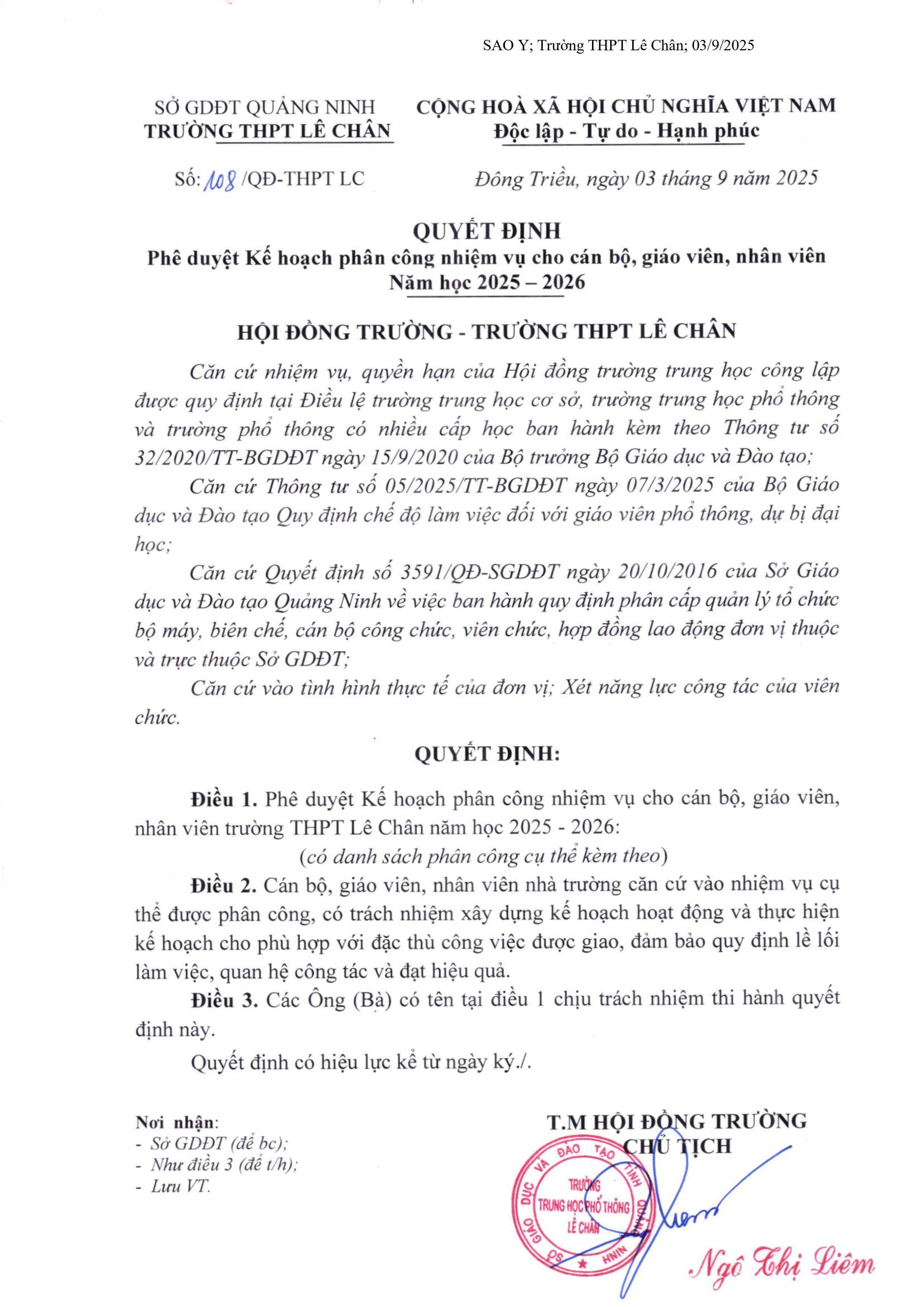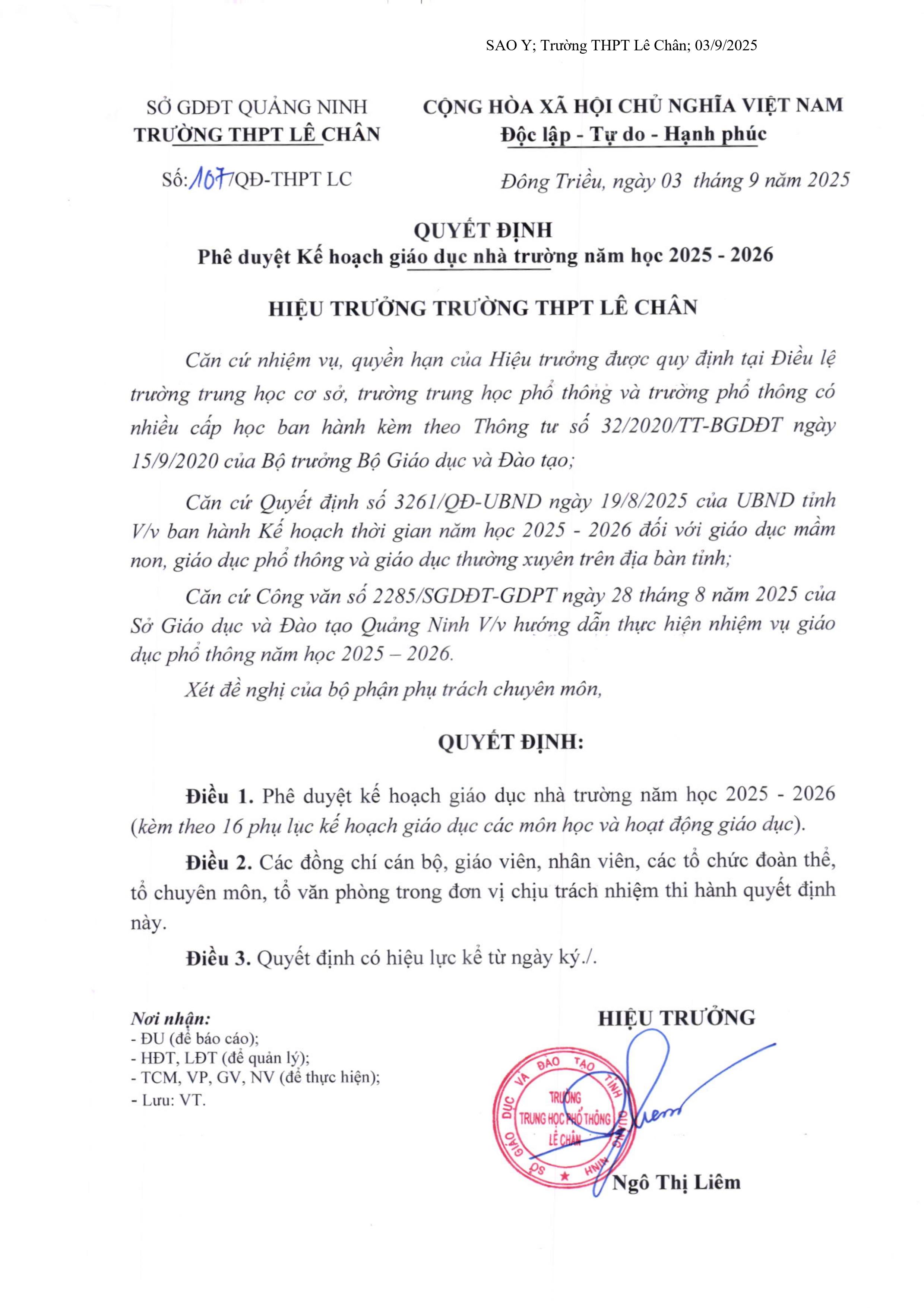 Quyết định số 107/QĐ-THPT LC ngày 03/09/2025 của Hiệu trưởng trường THPT Lê Chân Về việc Phê duyệt...