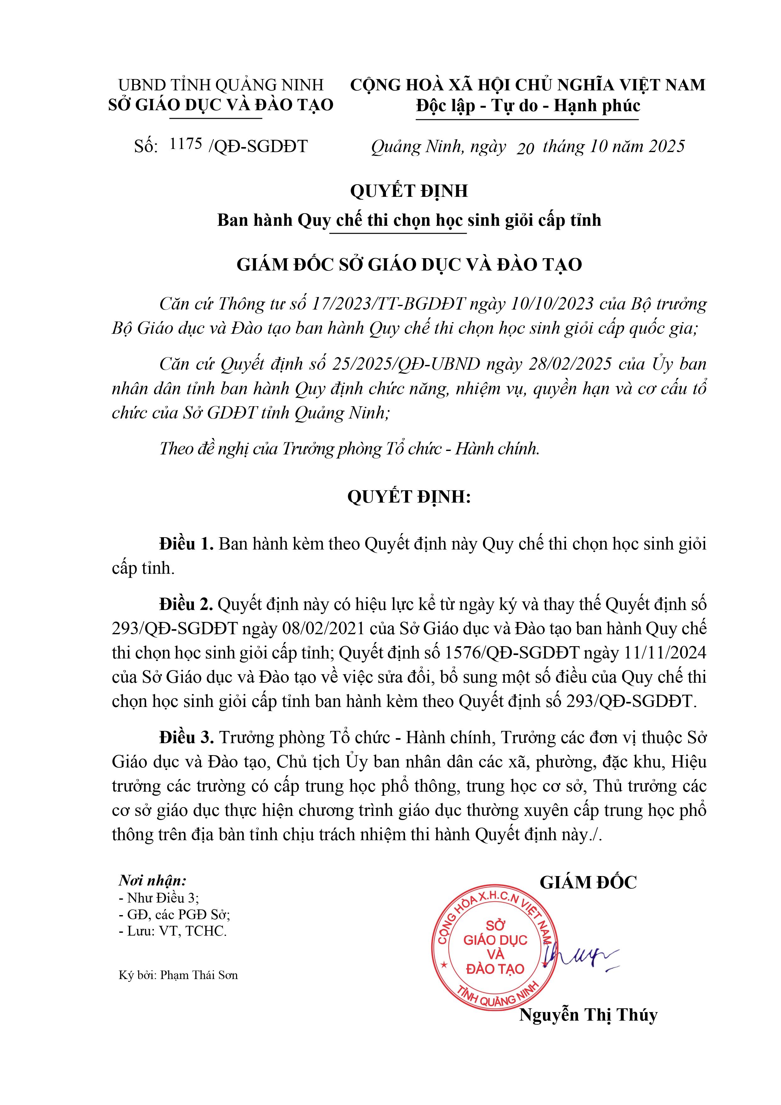 Quyết định số 1175/QĐ-SGDĐT ngày 20/10/2025 cảu Giám đốc Sở Giáo dục và Đào tạo về việc Ban hành...