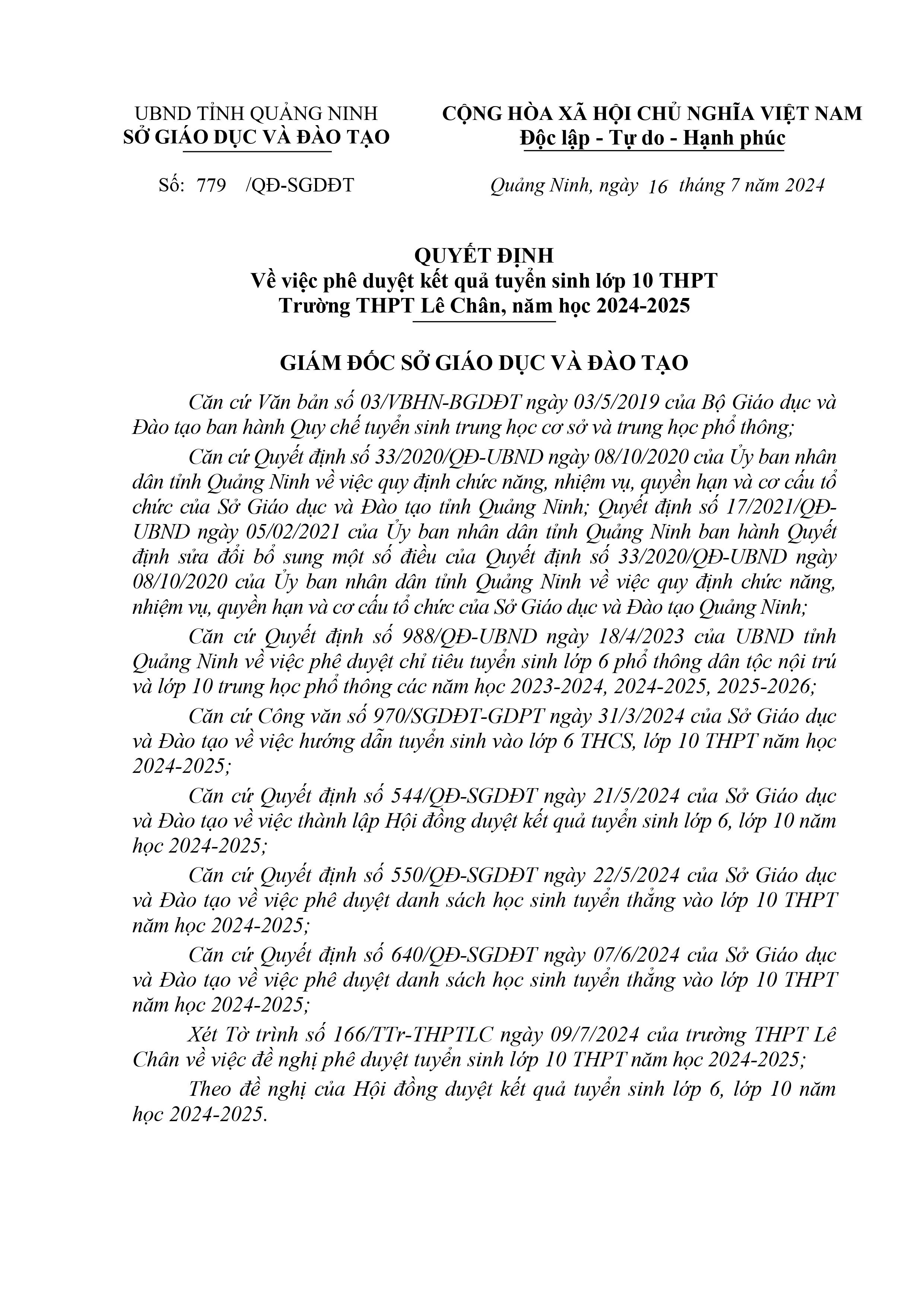 Phê duyệt kết quả tuyển sinh lớp 10 trường THPT Lê Chân năm học 2023-2024