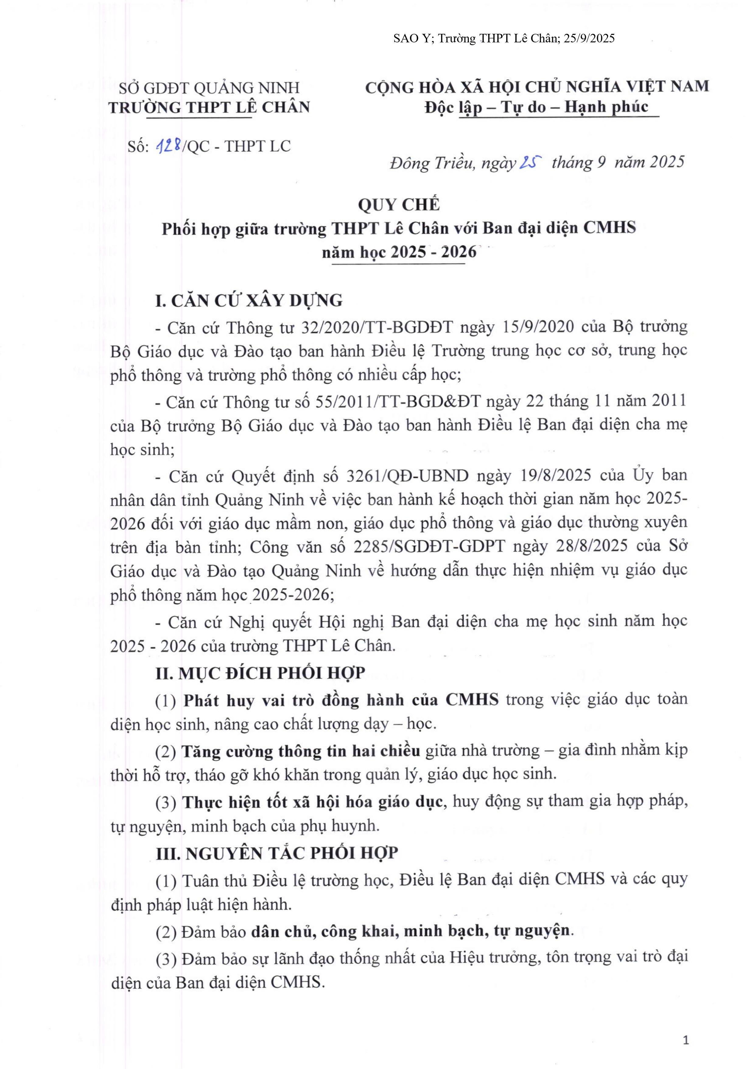 Quy chế số 128/QC-THPT LC ngày 25/9/2025 của Trường THPT Lê Chân Quy chế phối hợp giữa trường THPT...