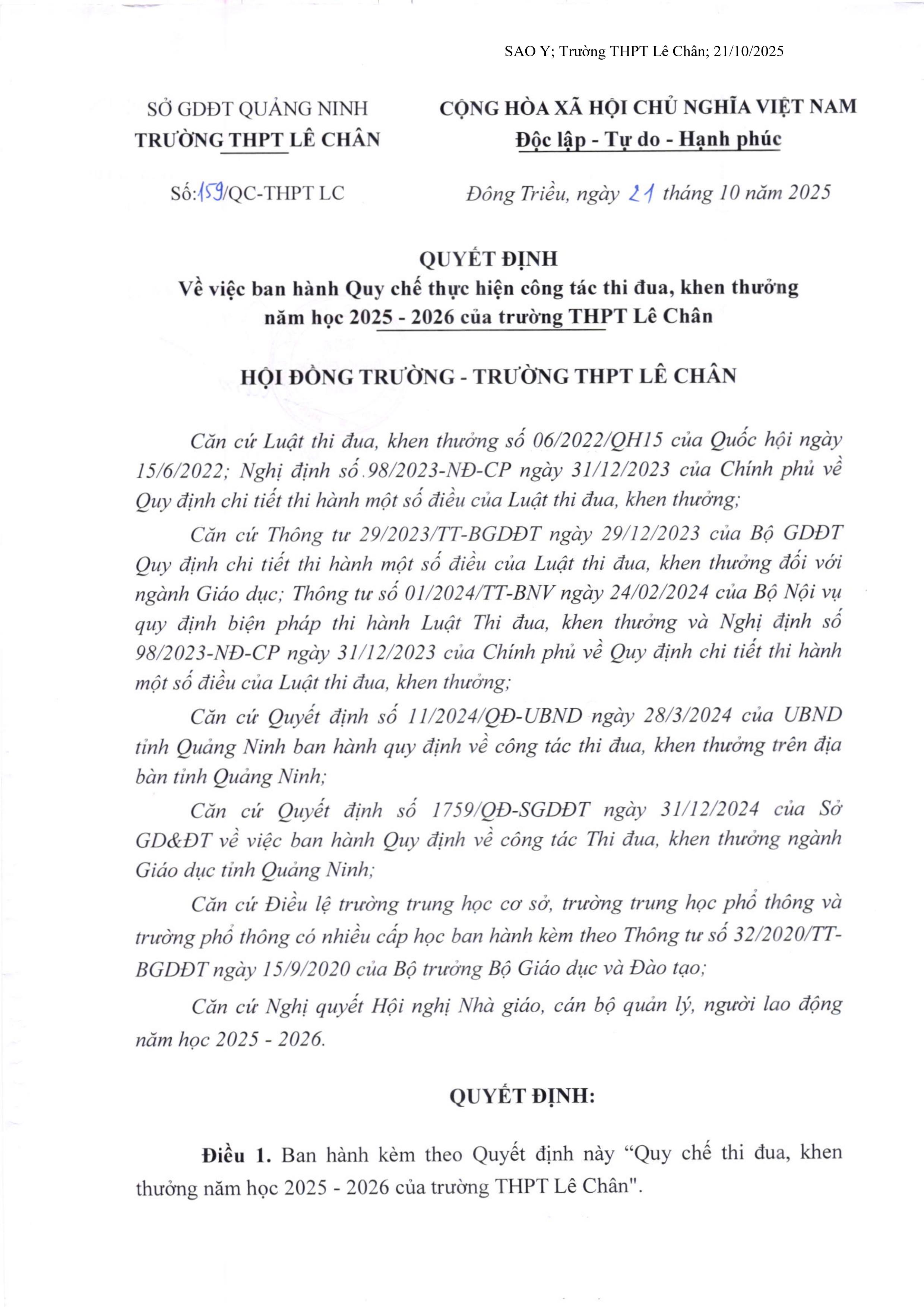 Quyết định số 159/QĐ-THPT LC ngày 21/10/2025 của Trường THPT Lê Chân về việc Ban hành Quy chế thực hiện công tác thi đua, khen thưởng năm học 2025 - 2026 của trường THPT Lê Chân năm học 2025 - 2026