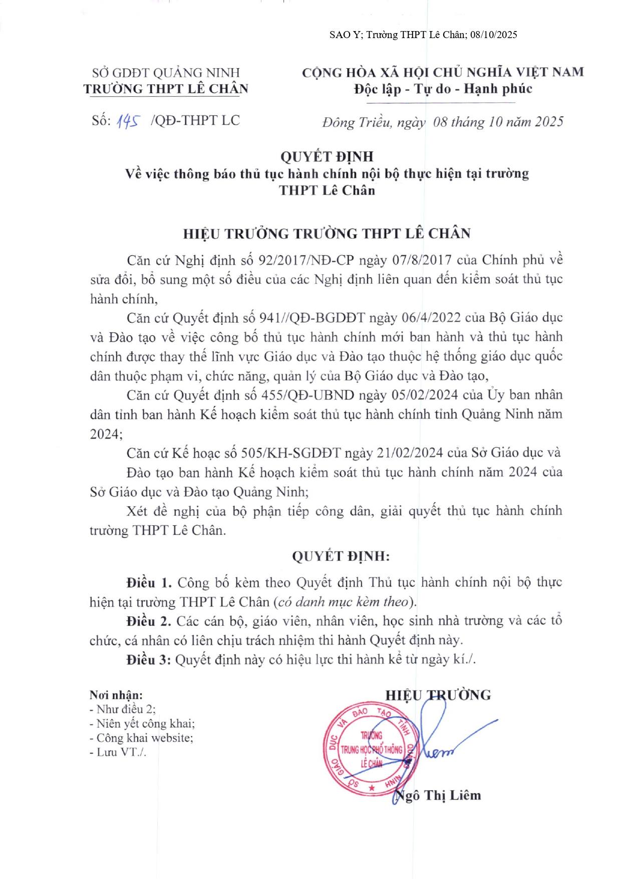 Quyết định số 145/QĐ-THPT LC ngày 08/10/2025 của Hiệu trưởng trường THPT Lê Chân Về việc thông báo...