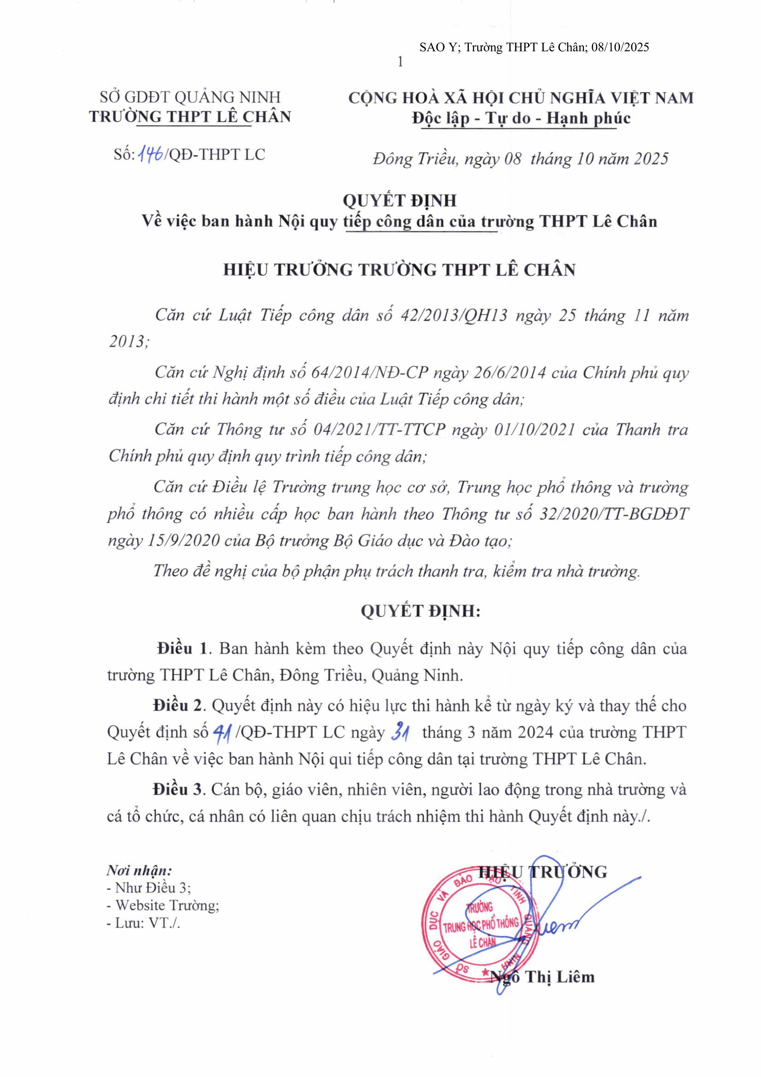 Quyết định số 146/QĐ-THPT LC ngày 09/10/2025 Về việc ban hành Nội quy tiếp công dân của trường THPT...