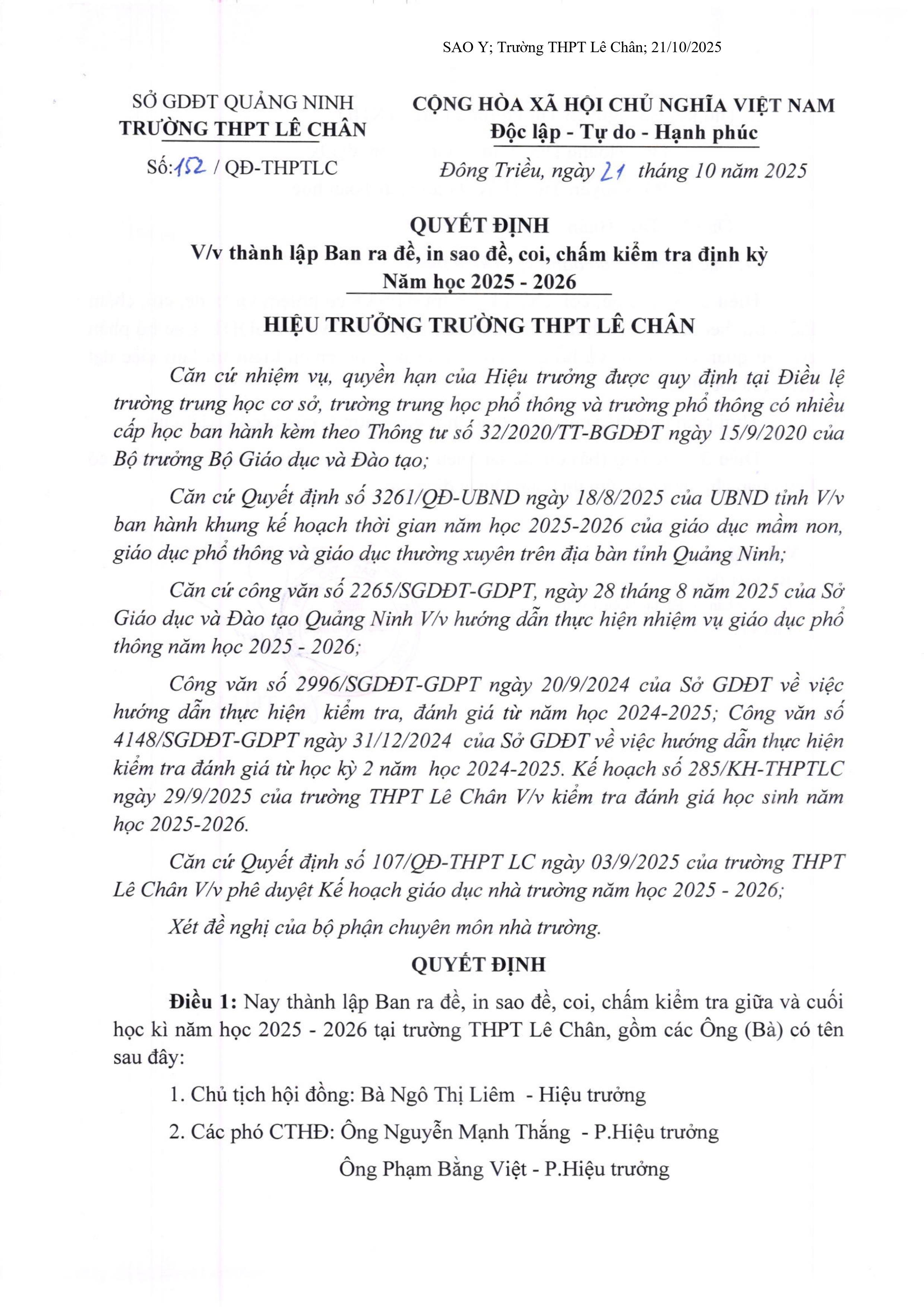 Quyết định số 152/QĐ-THPT LC ngày 21/10/2025 của Hiệu trưởng trường THPT Lê Chân về việc Thành lập Ban ra đề, in sao đề, coi, chấm kiểm tra định kỳ năm học 2025 - 2026