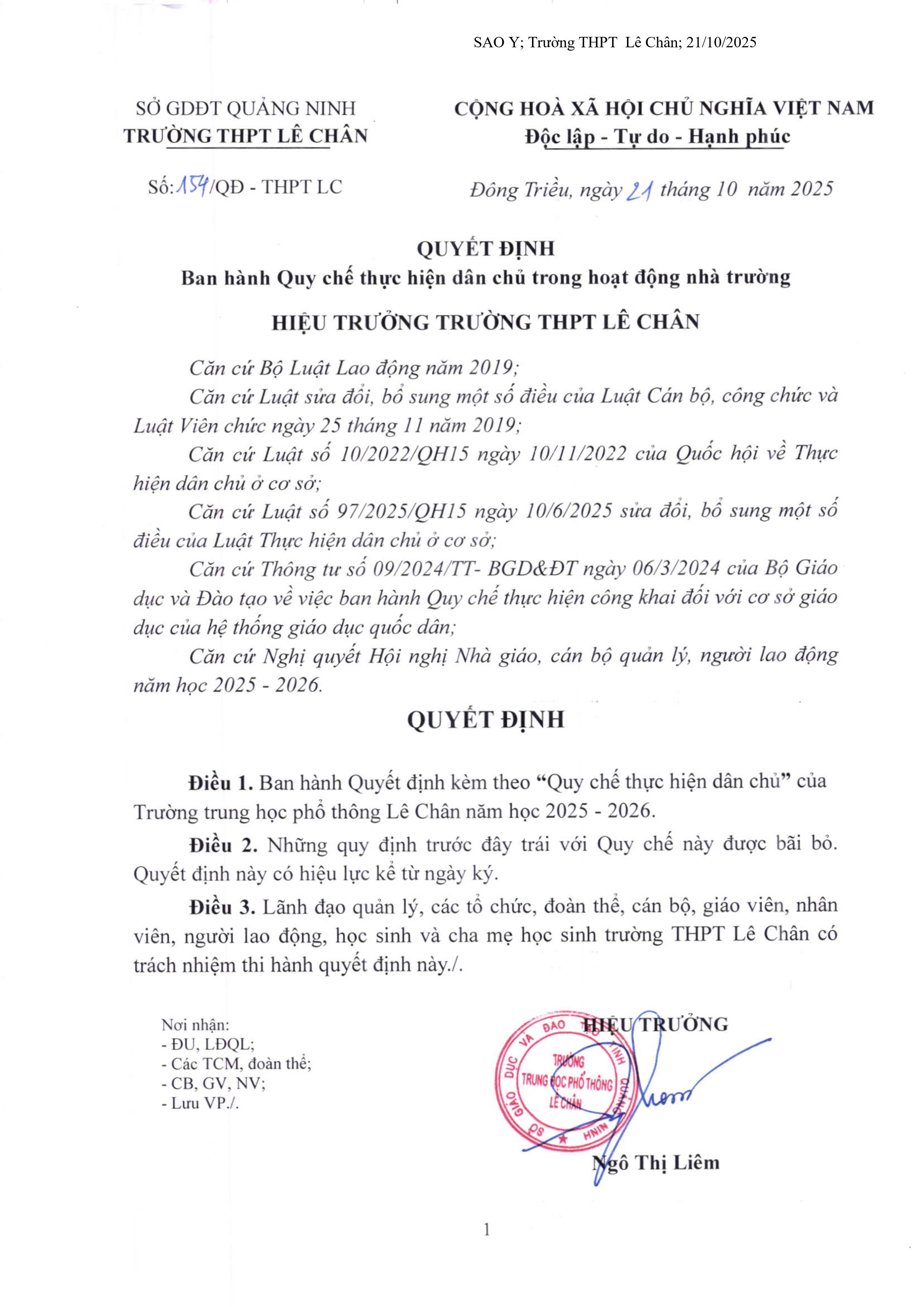 Quyết định số 154/QĐ-THPT LC ngày 21/10/2025 của Trường THPT Lê Chân về việc Ban hành Quy chế thực...