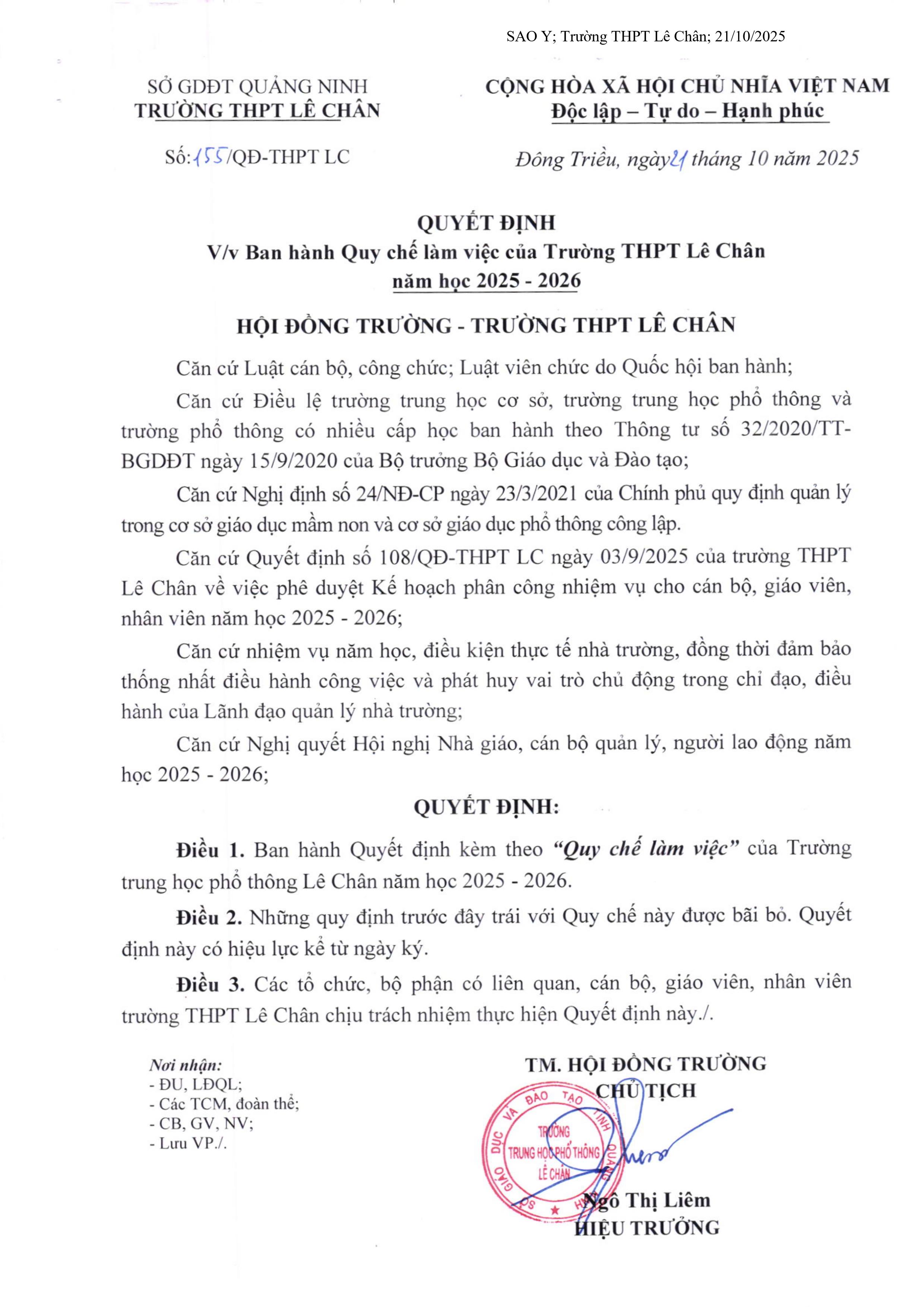 Quyết định số 155/QĐ-THPT LC ngày 21/10/2025 của Trường THPT Lê Chân về việc Ban hành Quy chế làm...