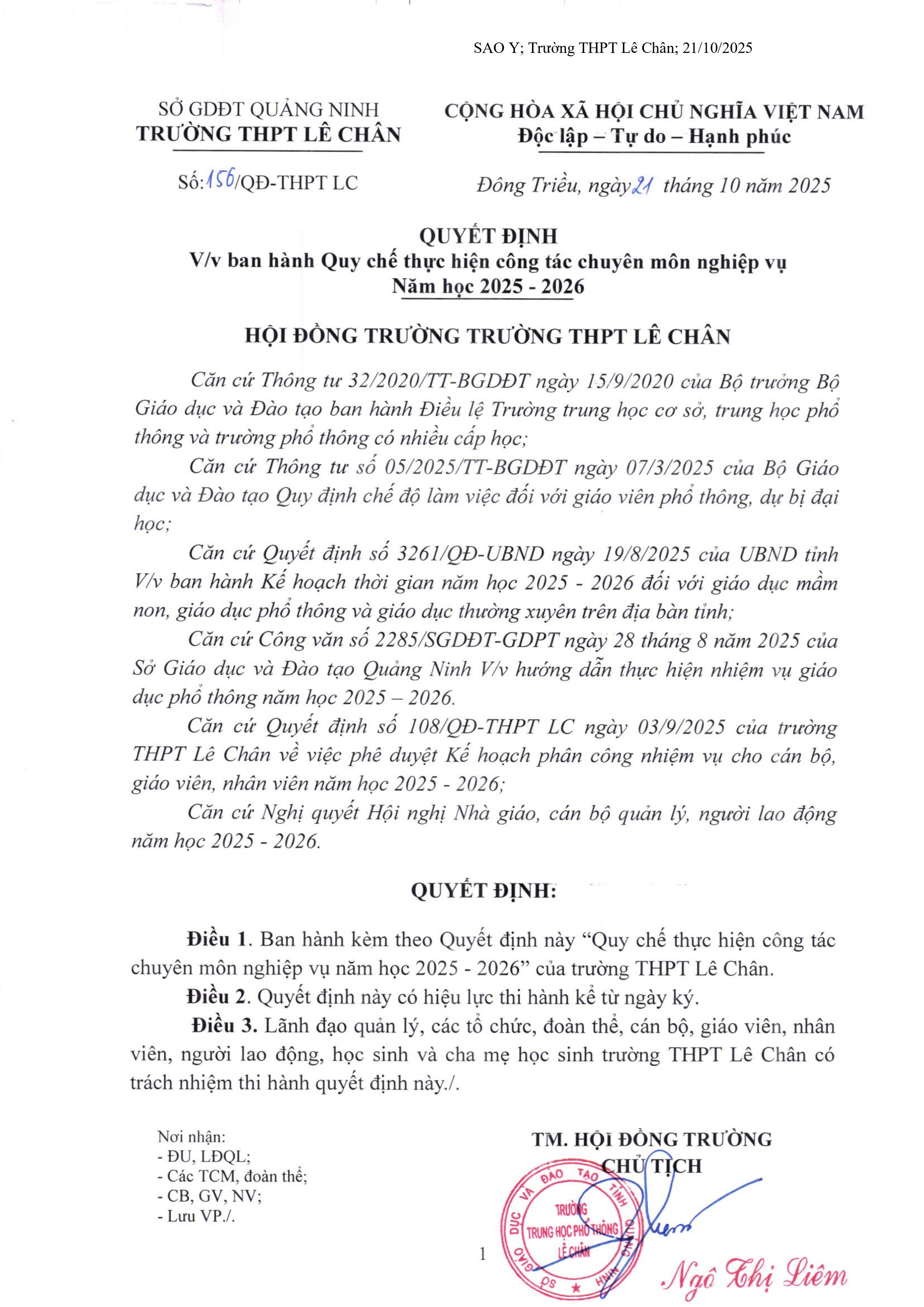 Quyết định số 156/QĐ-THPT LC ngày 21/10/2025 của Trường THPT Lê Chân về việc Ban hành Quy chế thực hiện công tác chuyên môn nghiệp vụ năm học 2025 - 2026