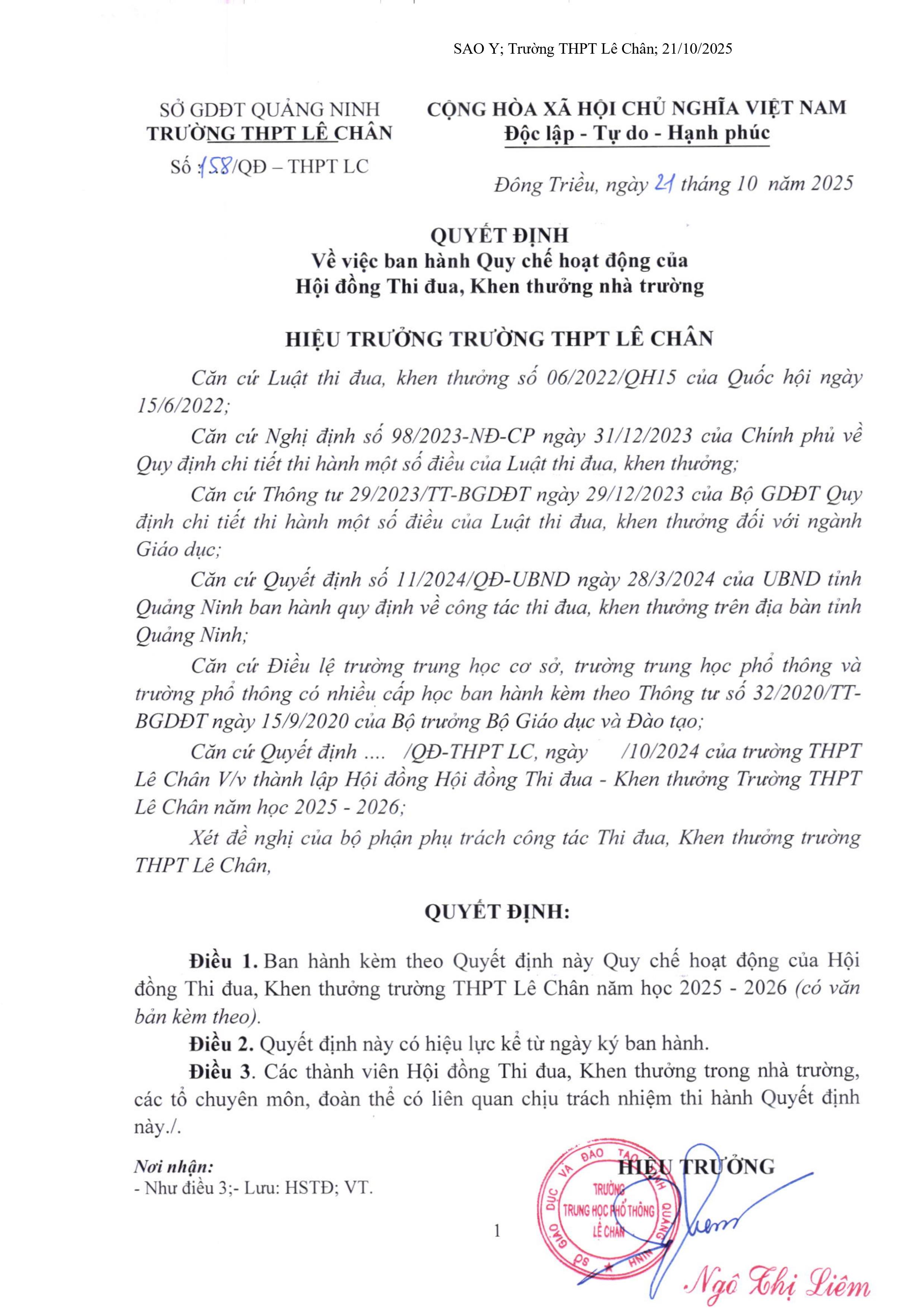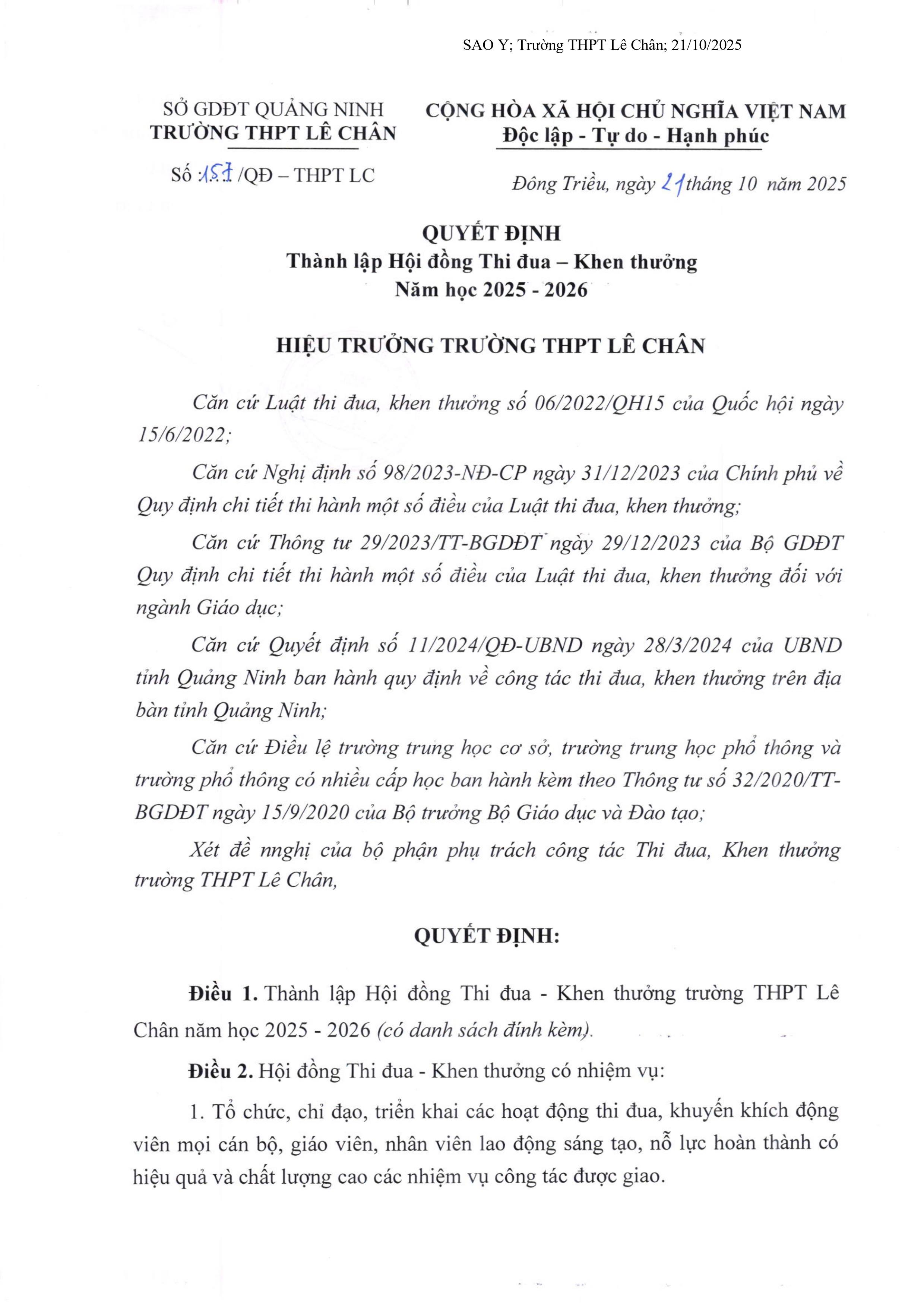 Quyết định số 157/QĐ-THPT LC ngày 21/10/2025 của Trường THPT Lê Chân về việc Thành lập Hội đồng Thi đua - Khen thưởng năm học 2025 - 2026