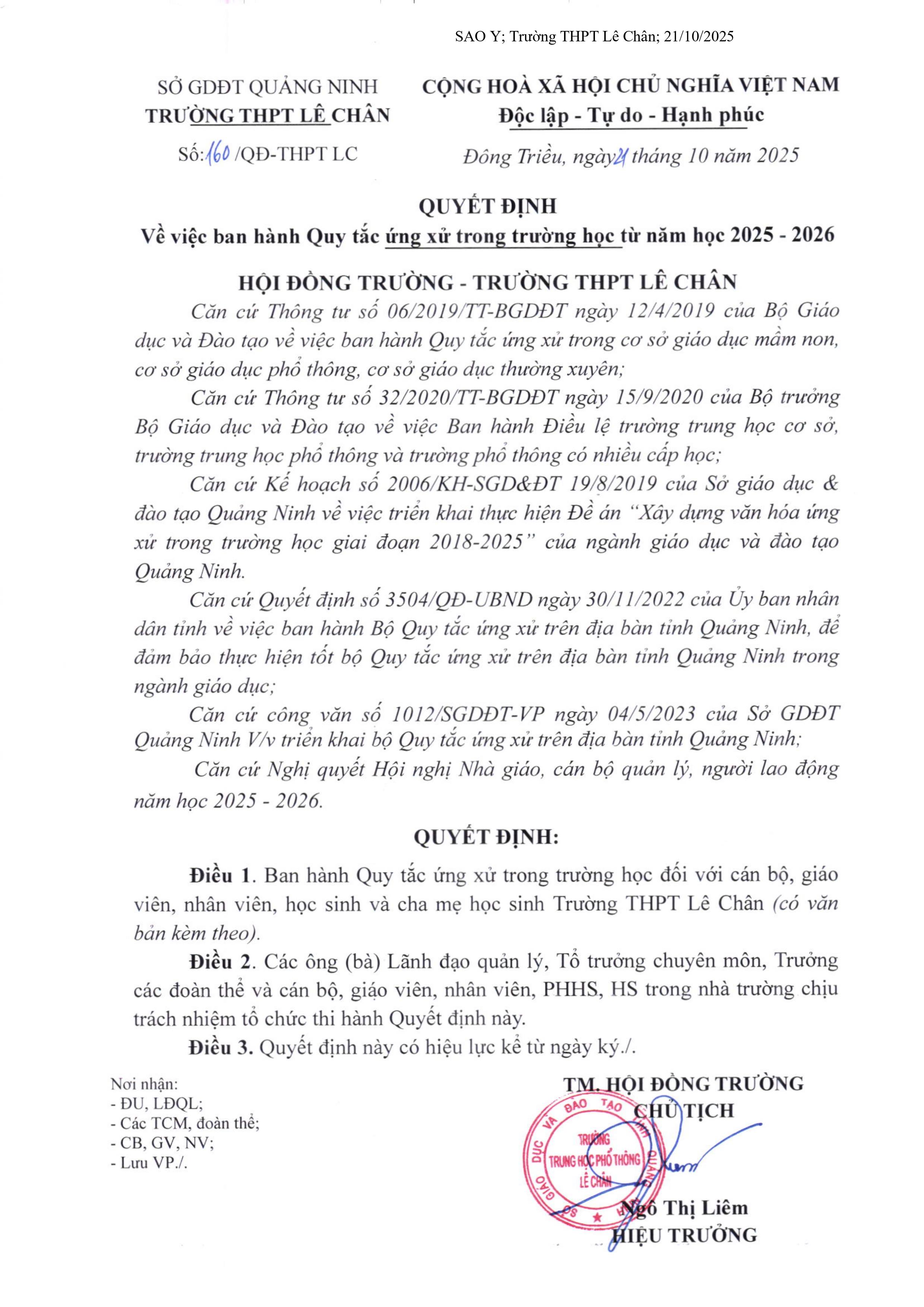 Quyết định số 160/QĐ-THPT LC ngày 21/10/2025 của Trường THPT Lê Chân về việc Ban hành Quy tắc ứng...