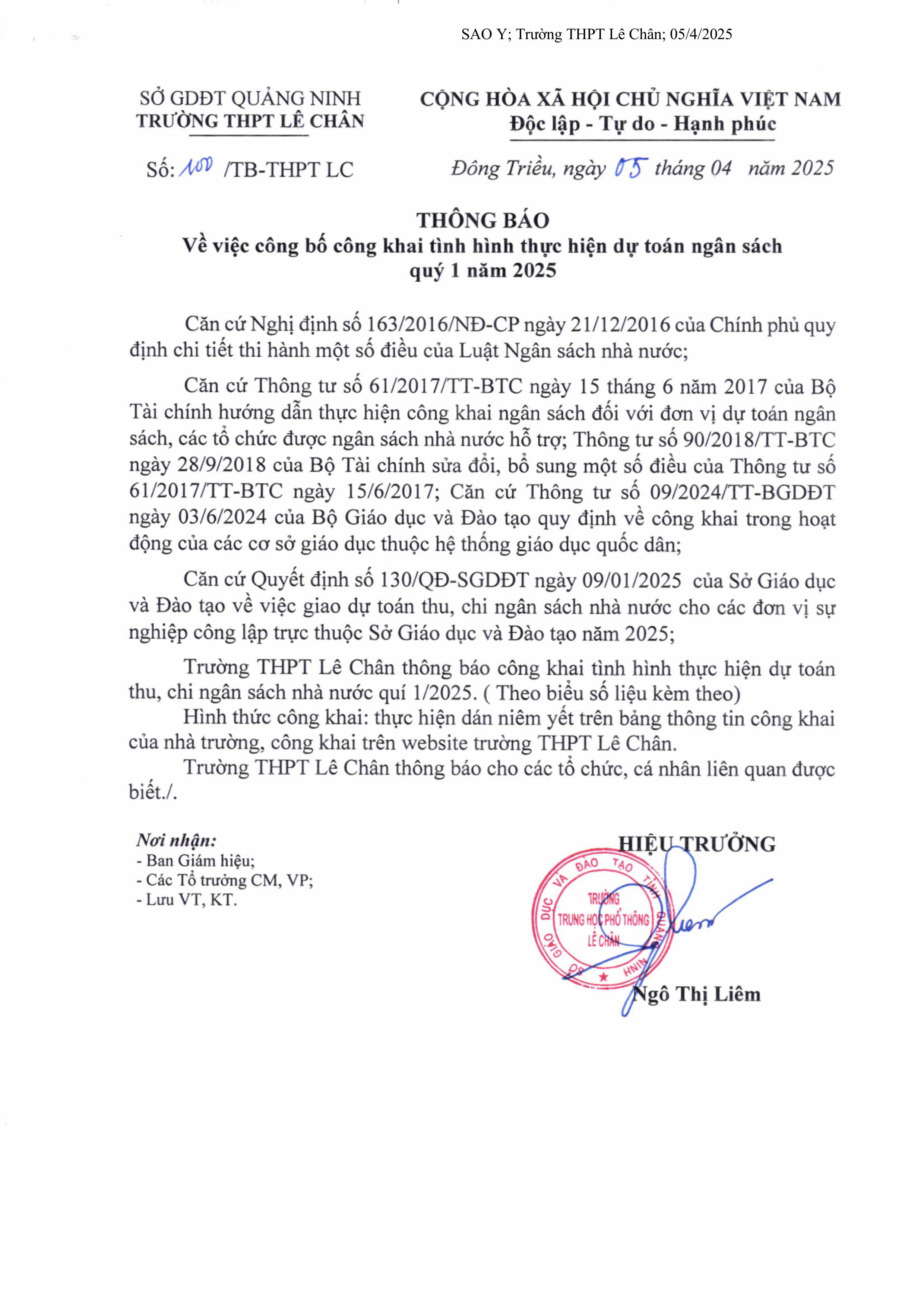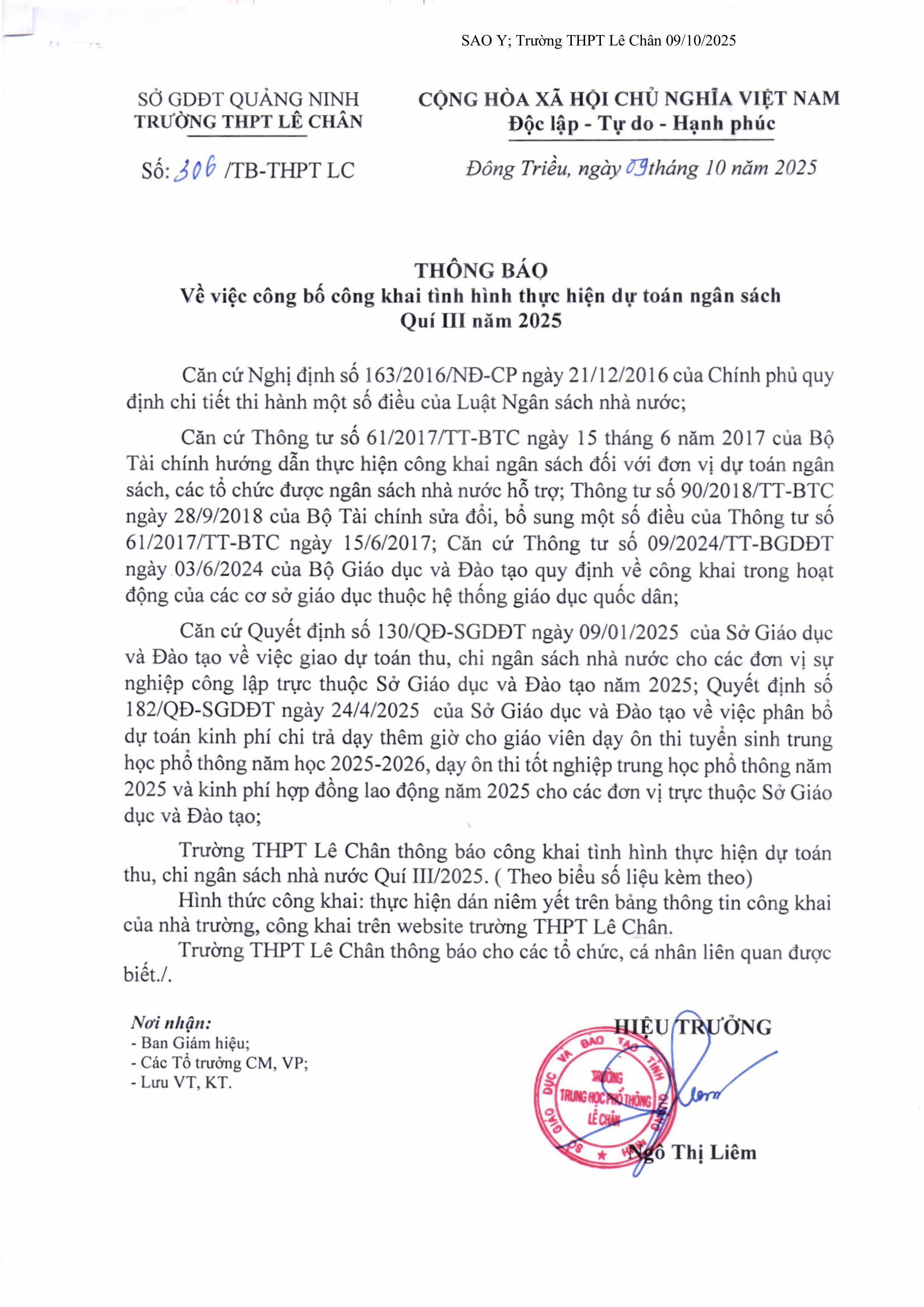 Thông báo số 306/TB-THPT LC ngày 09/10/2025 Về việc Công bố, công khai tình hình thực hiện dự toán...