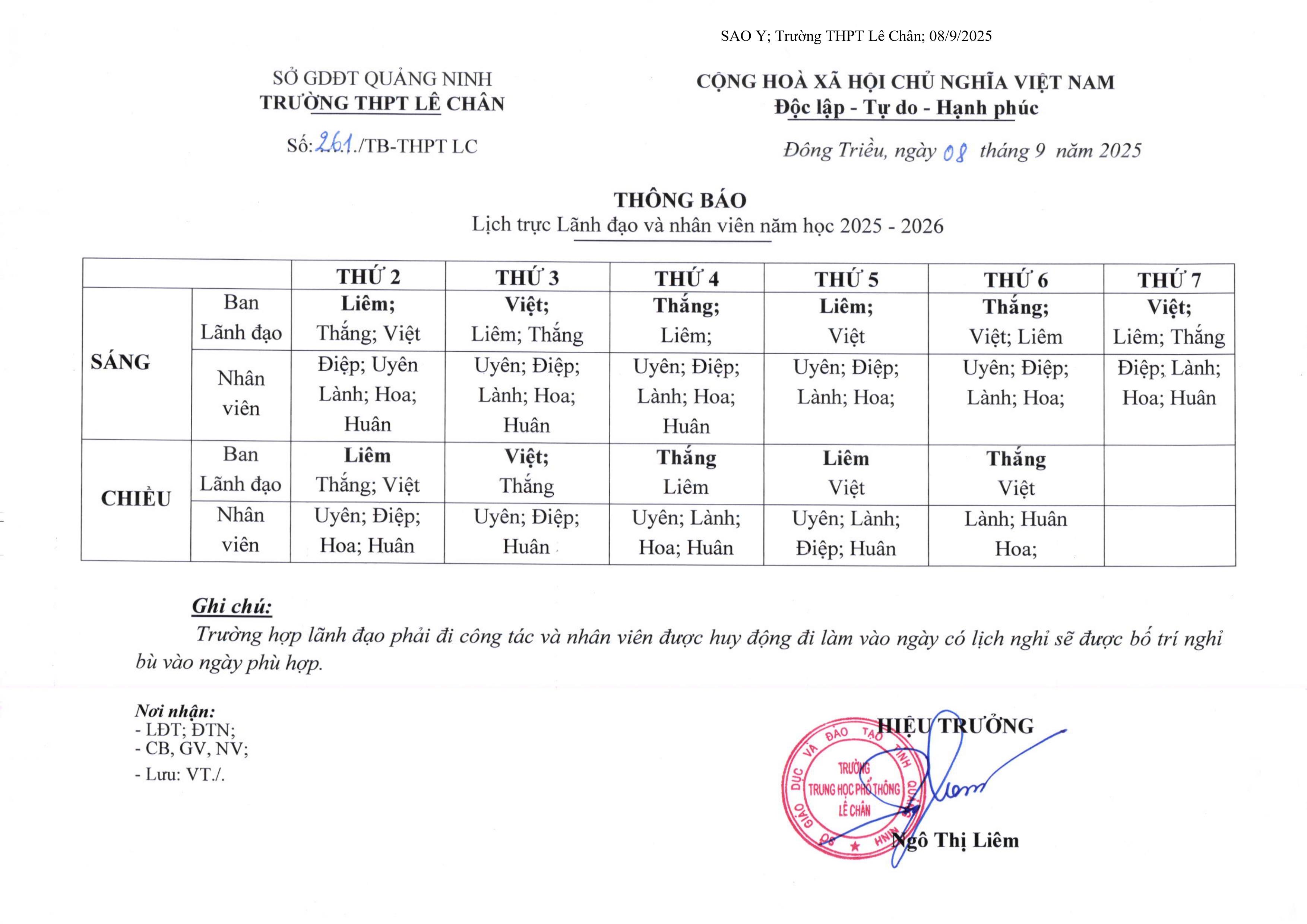 Thông báo số 261/TB-THPT LC ngày 08/9/2025 của Trường THPT Lê Chân Lịch trực Lãnh đạo và nhân viên...